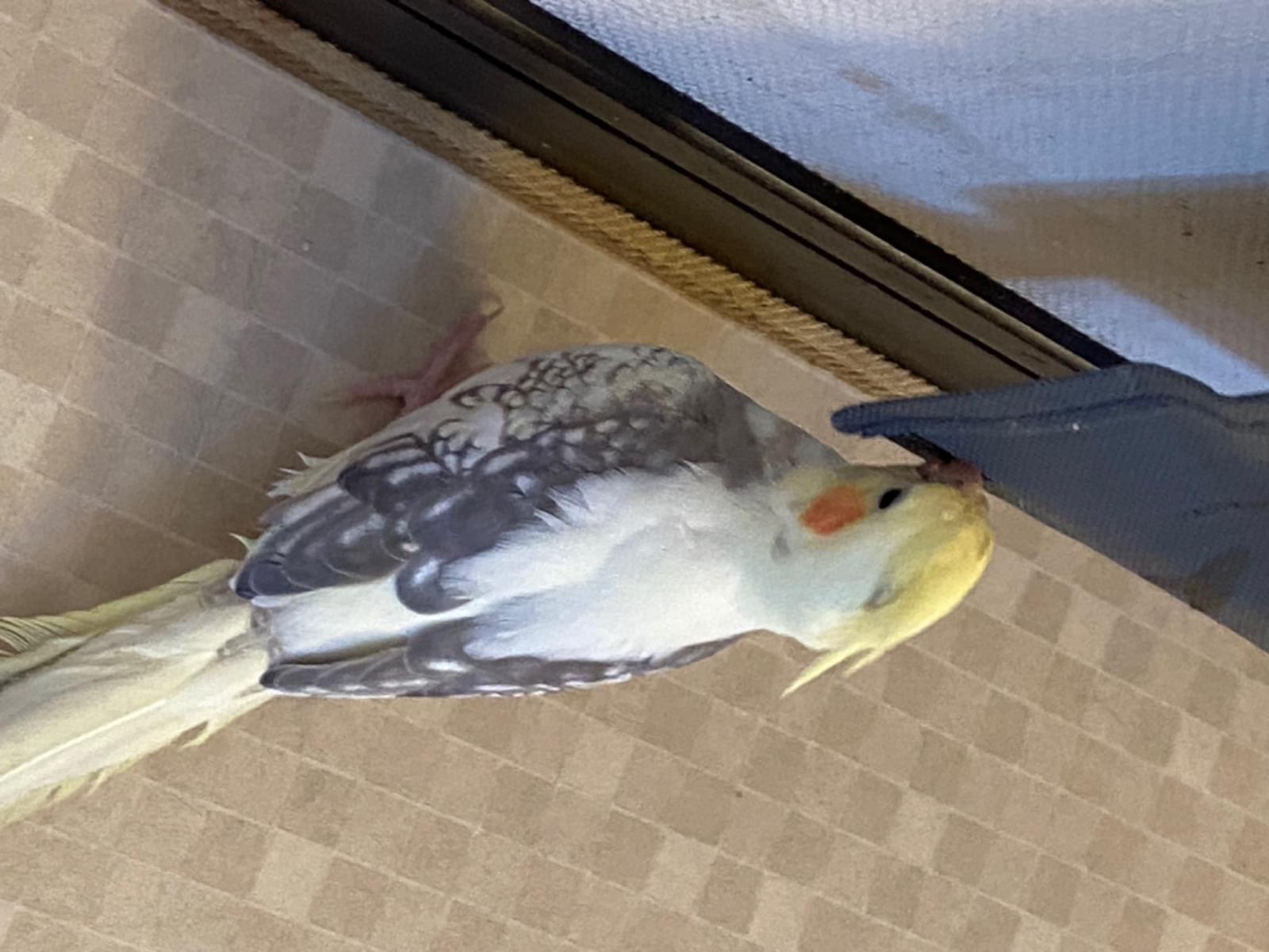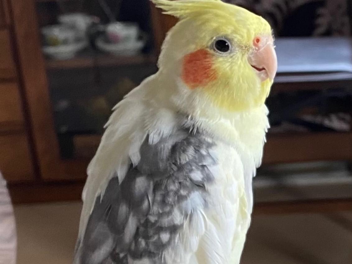 オカメインコ、橙ほっぺ、身体黄色で羽根に灰色のマダラ模様あり。ウグイス鳴き真似、幸せなら手を叩こうを歌います。頭や上半身をなでると気持ちよさそうにします。わりと人馴れしています。