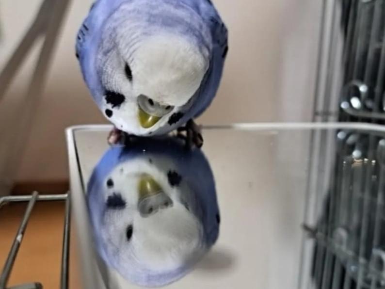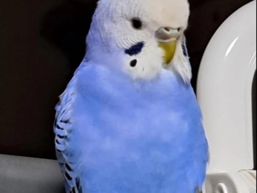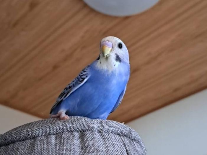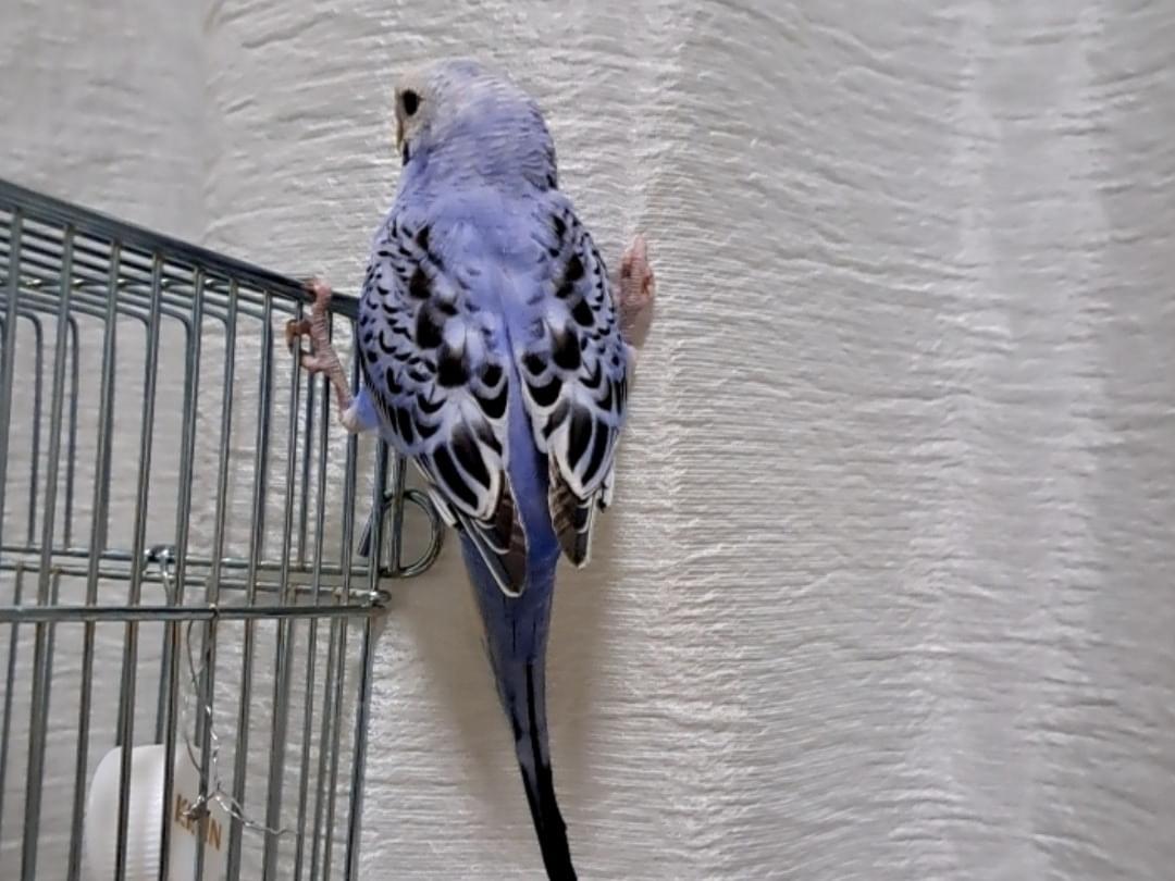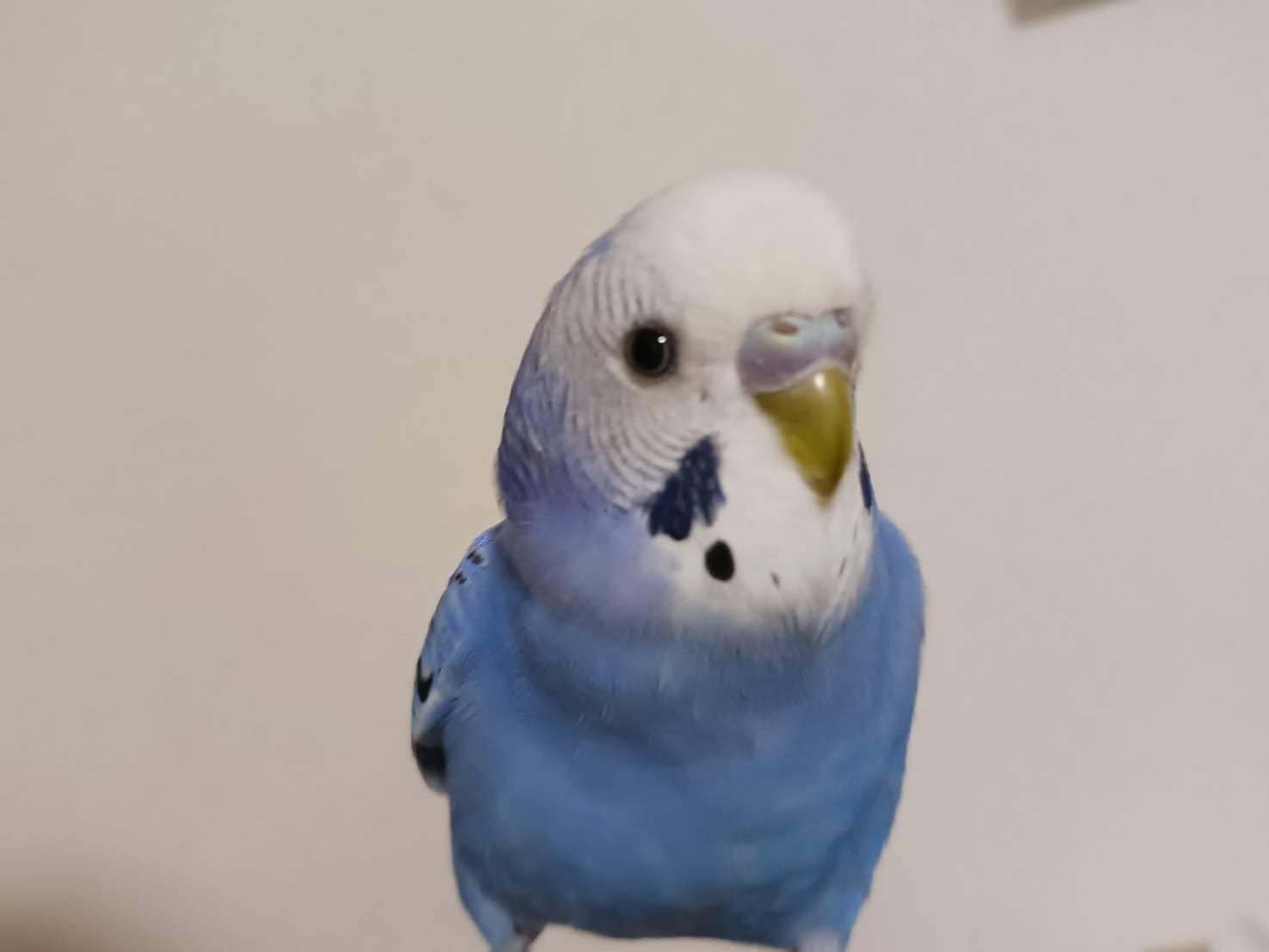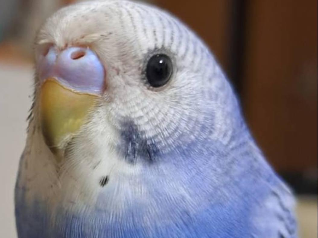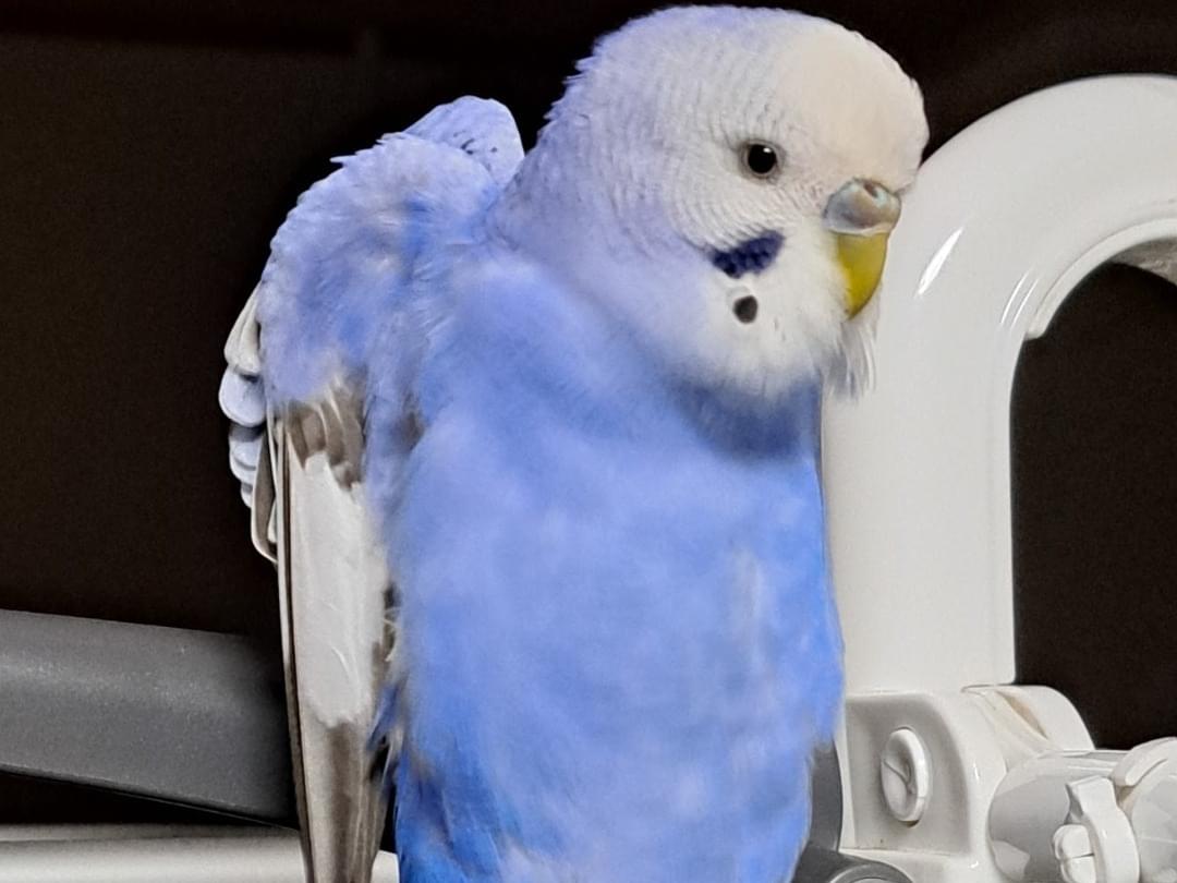 頭が白い体は青い鼻は青紫くちばしは黄色い足はピンクで襟あたりに黒い点々が4つ程度(羽が抜けたら数は異なる)