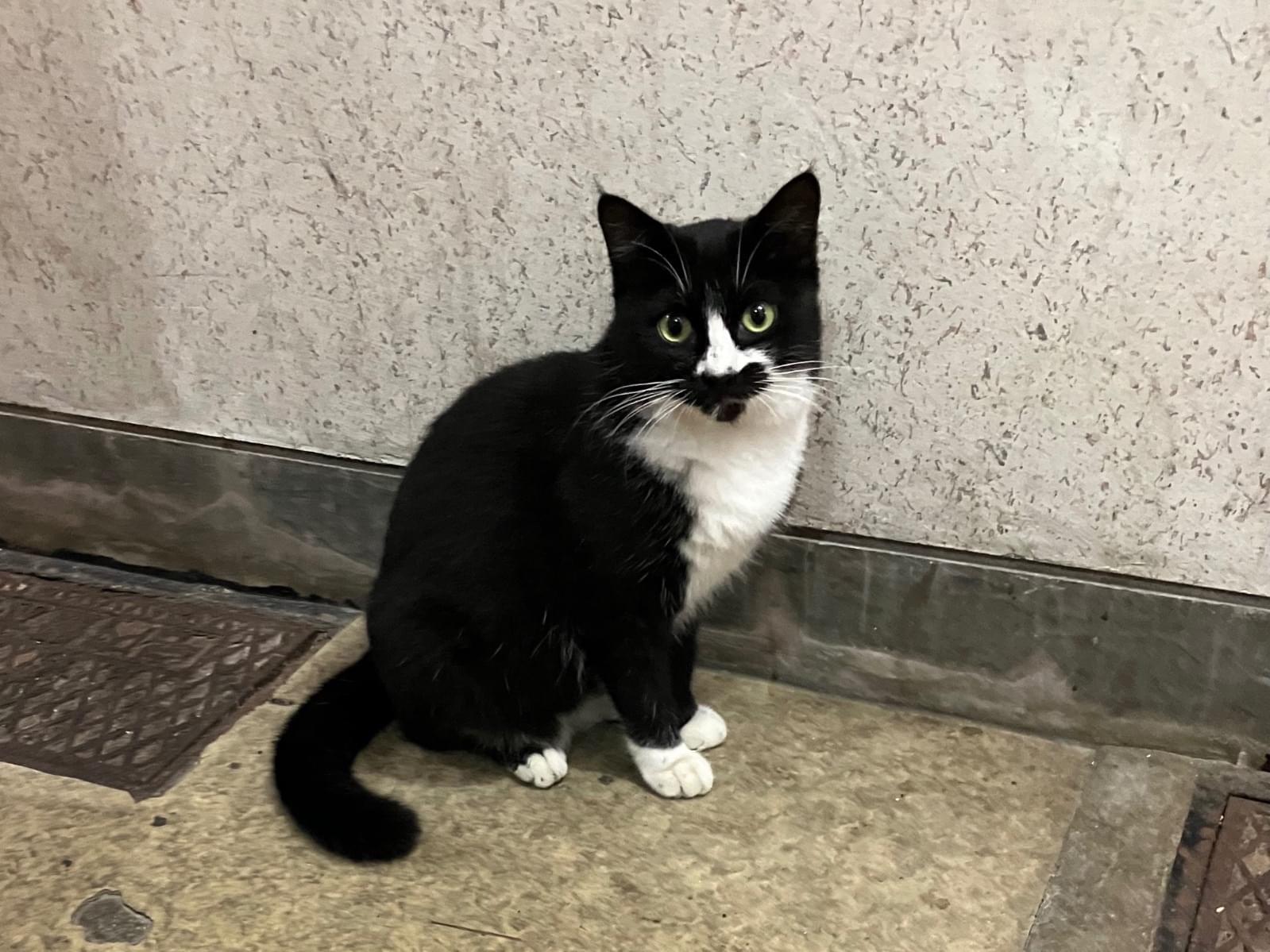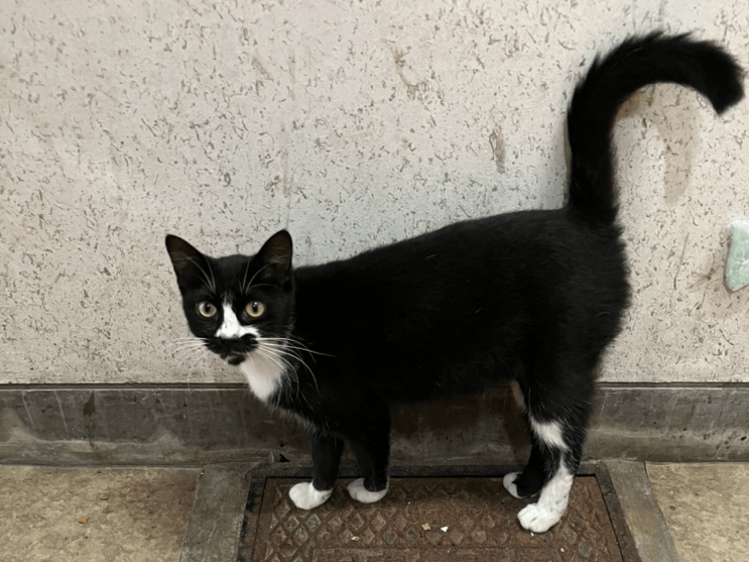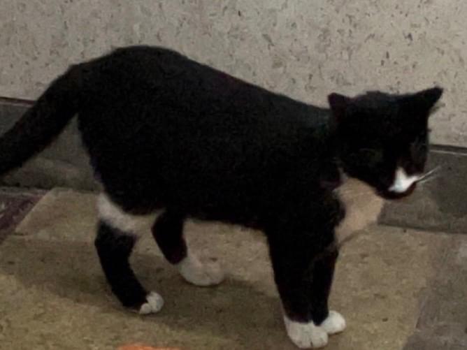 白黒タビ猫、右太ももにハチマキのような白いラインがあります。