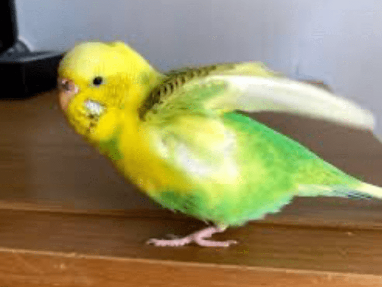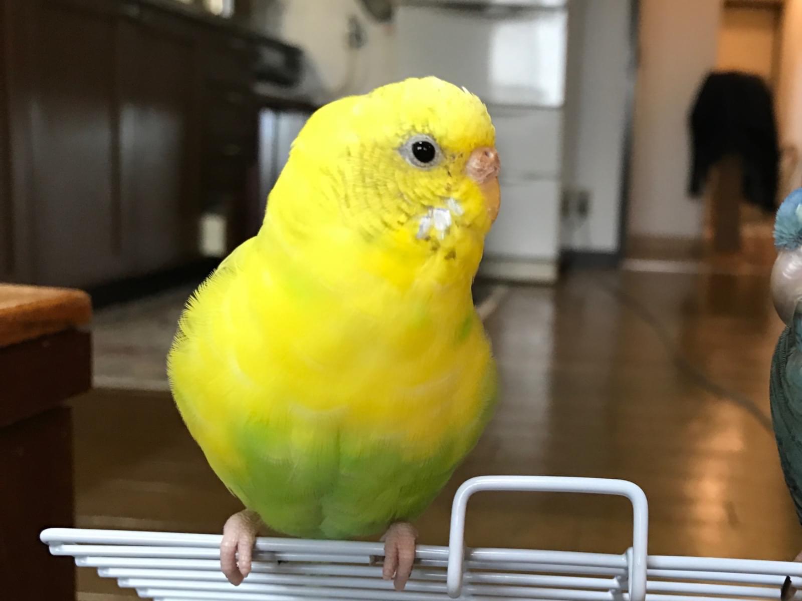 黄色と黄緑のセキセイインコ、名前はピーちゃんです。少し離れたところからでも「ピーちゃんおいで」と呼ぶと飛んできてくれます。