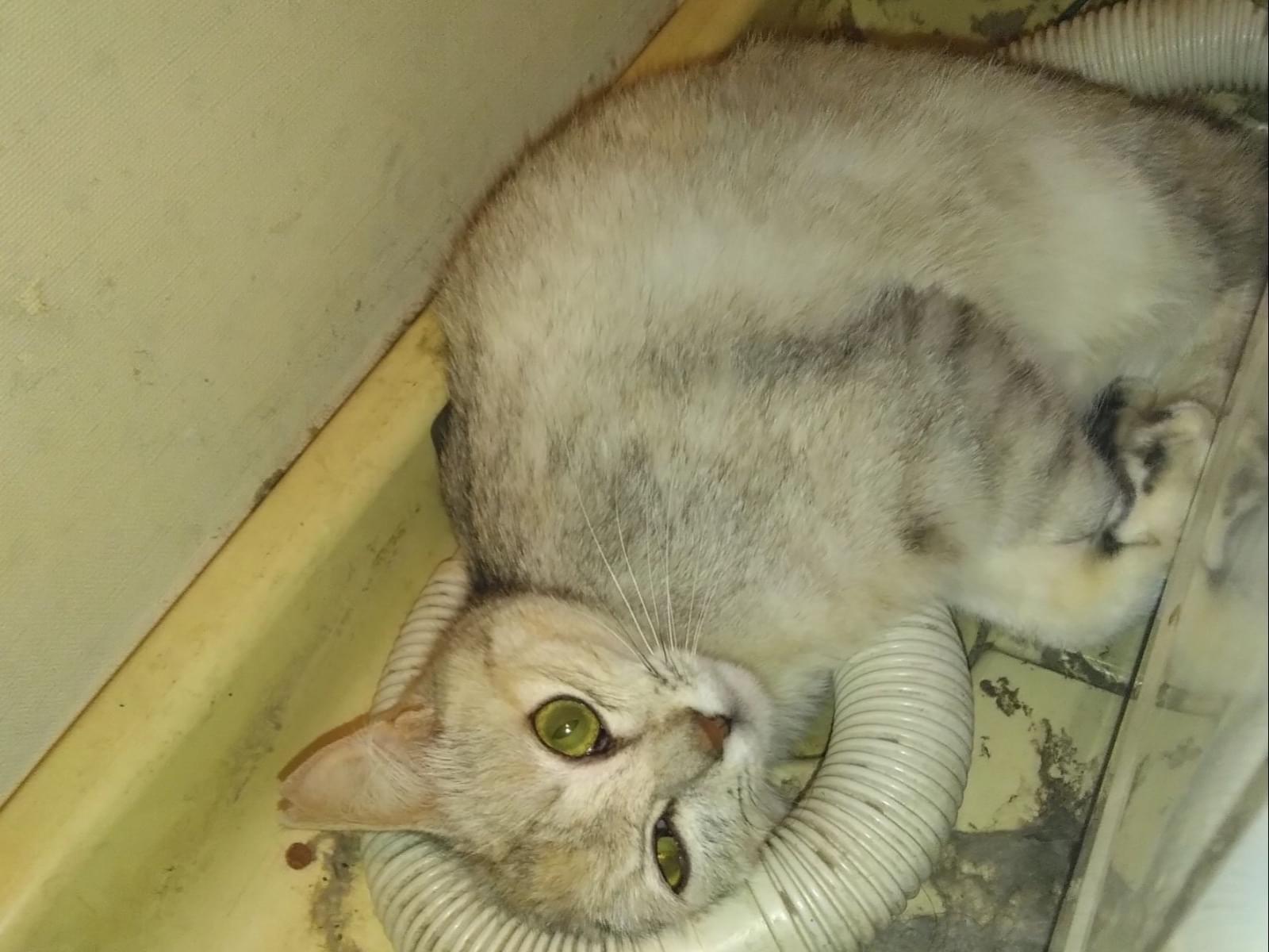 クリーム色に薄いグレーの柄で目はまるで黒いアイラインを引いたようになってて、尻尾は長く、声も高く、とても可愛い子です。