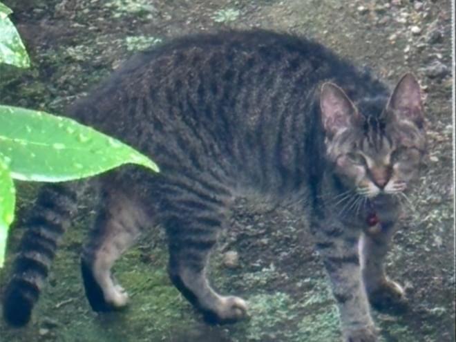 キジトラ子猫 しま模様のカラフルな首輪をしていました。