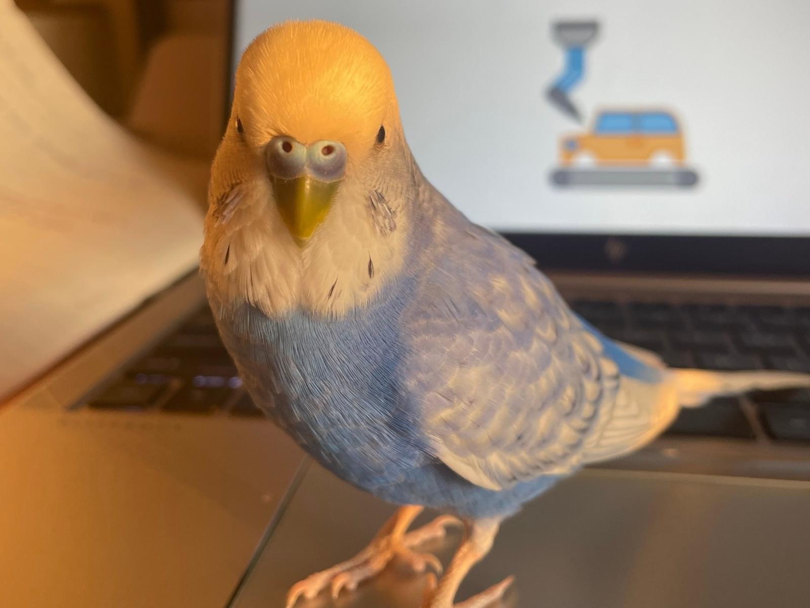 とても活発な、小さな青いオスのセキセイインコです。 人間と仲が良く、よく鳴きます。 彼はキュウリが好きです。 顔は白、体の残りの部分は空色です。
