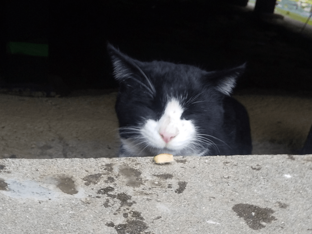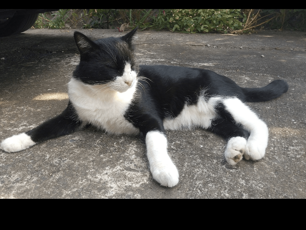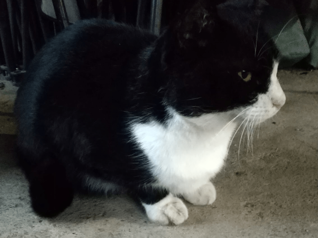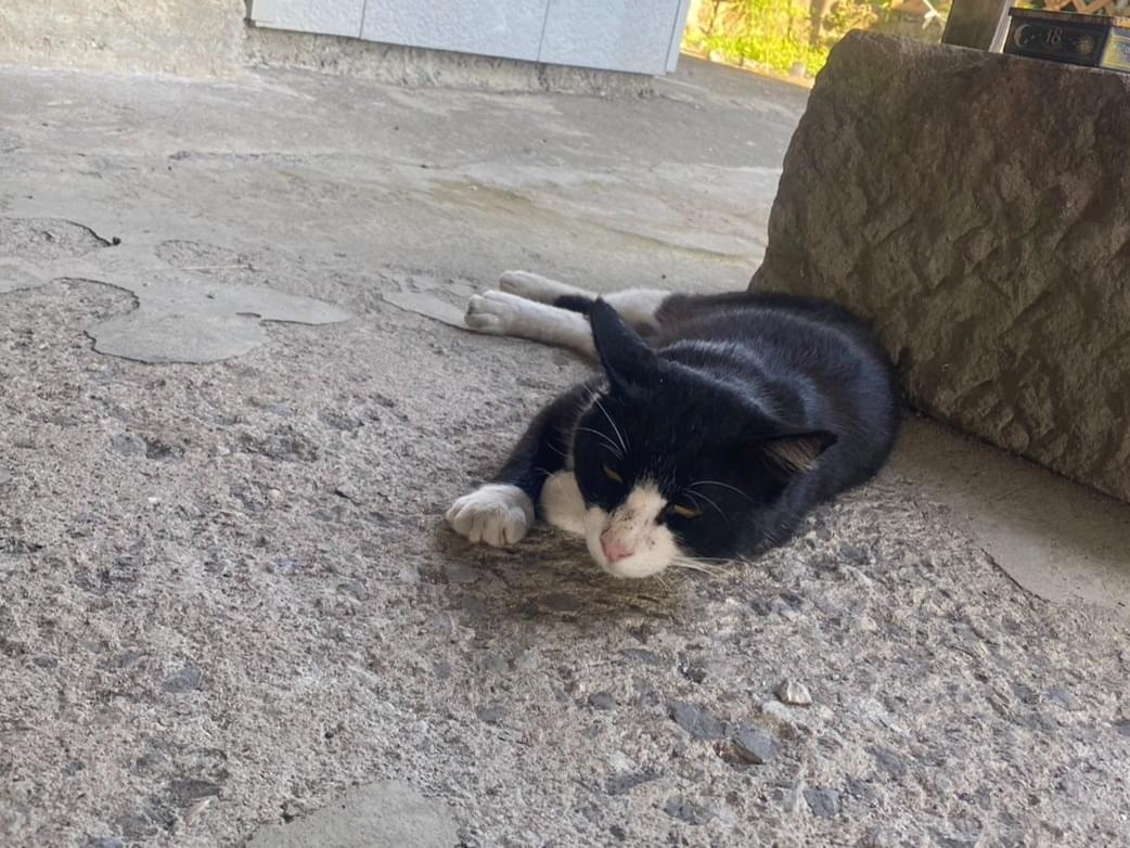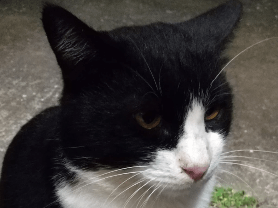 はちわれの猫を探しています。お腹は白、鼻はピンク、右前は足首から先が白、左足は白のソックスを履いた感