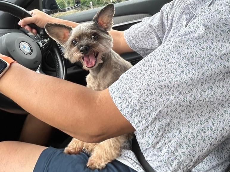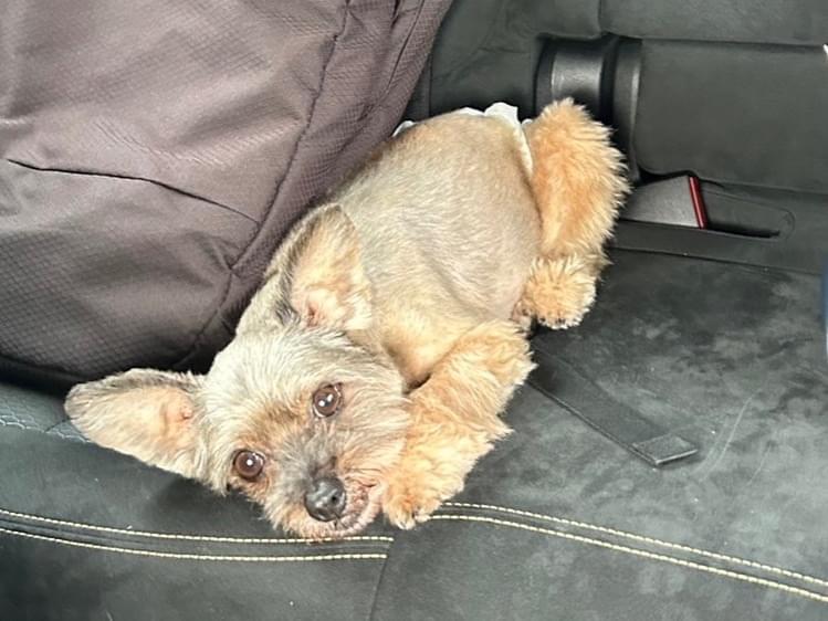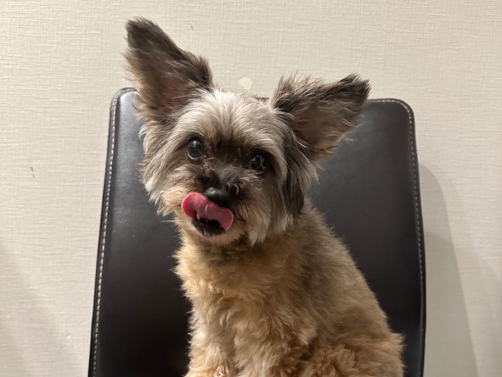 元保護犬のミックス(ポメプーとのことですが見た目は大きめのヨーキーっぽいです)、色はセーブル(グレーと茶色)です。