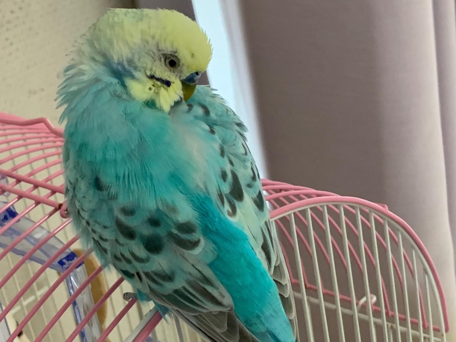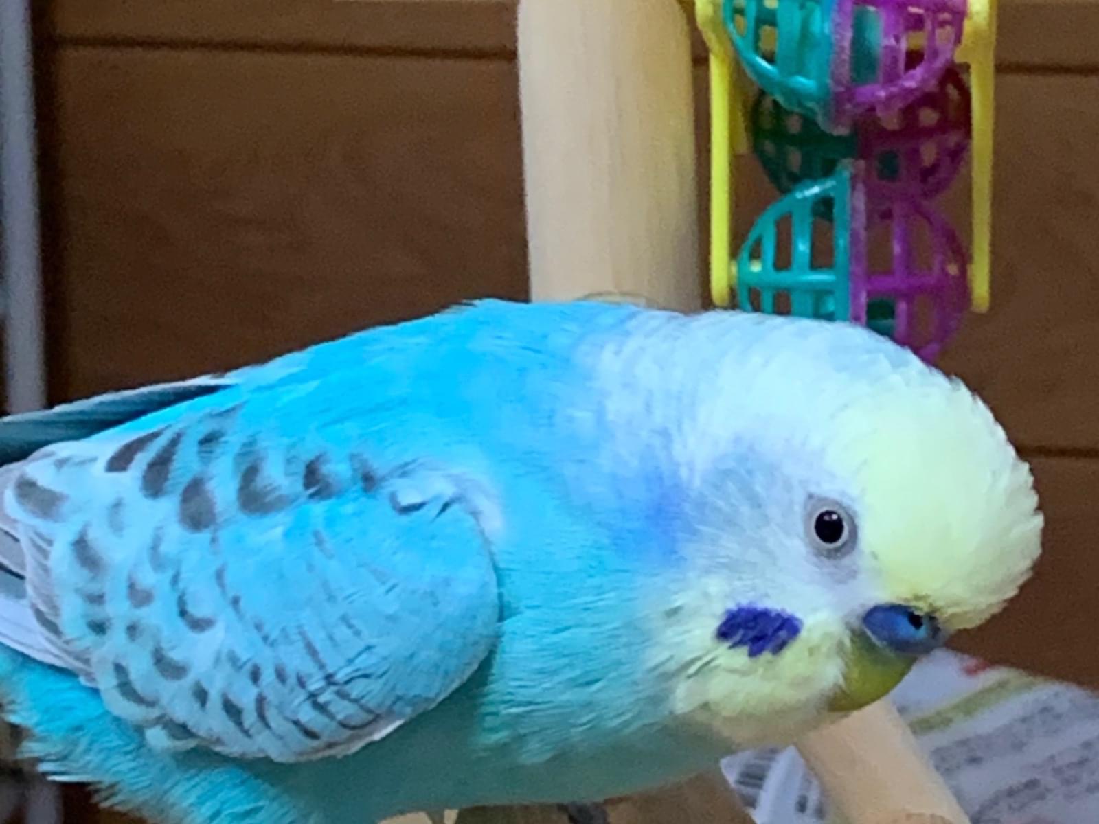 水色の体と黄色い顔、オスなので鼻が青いです。