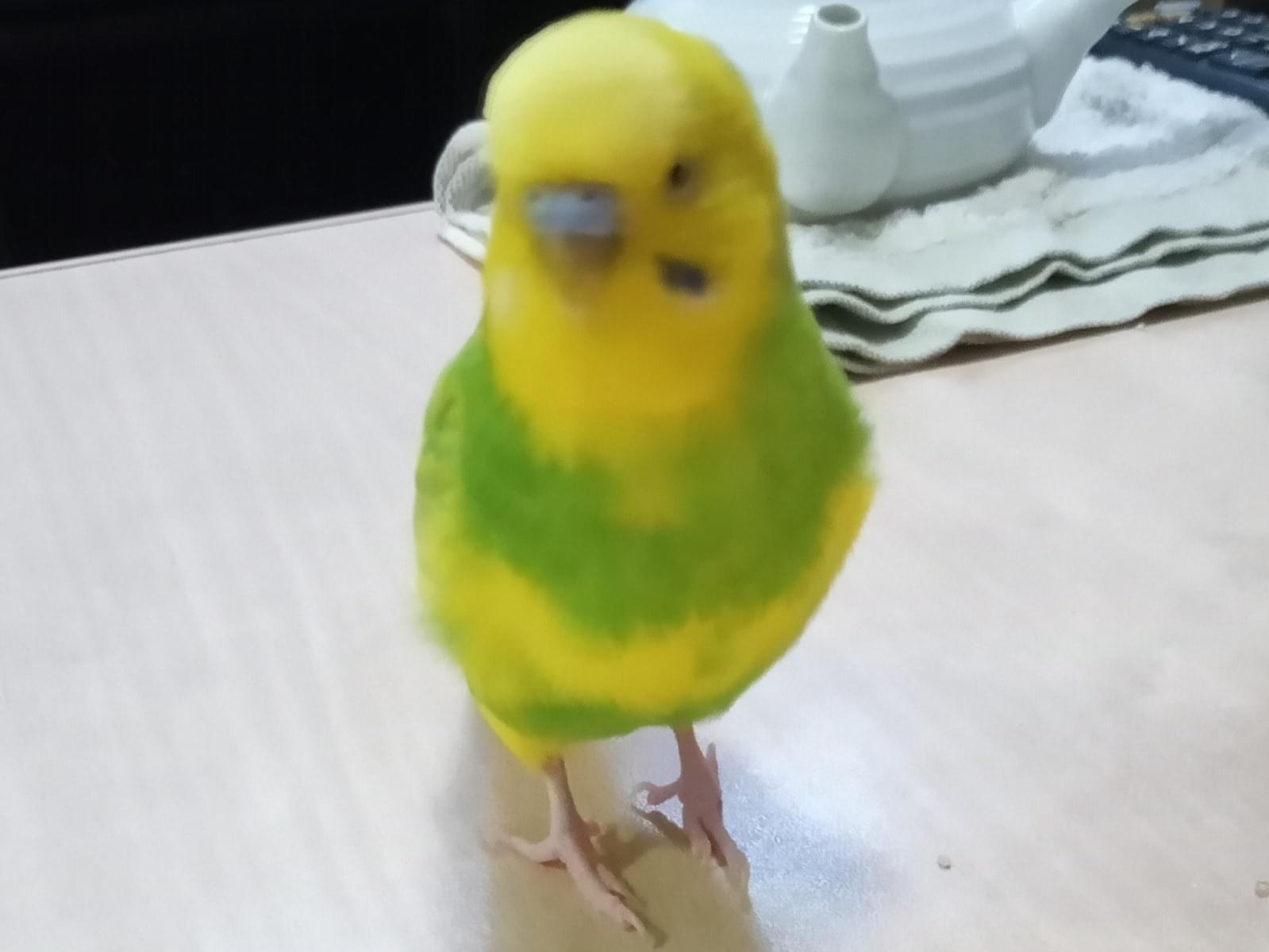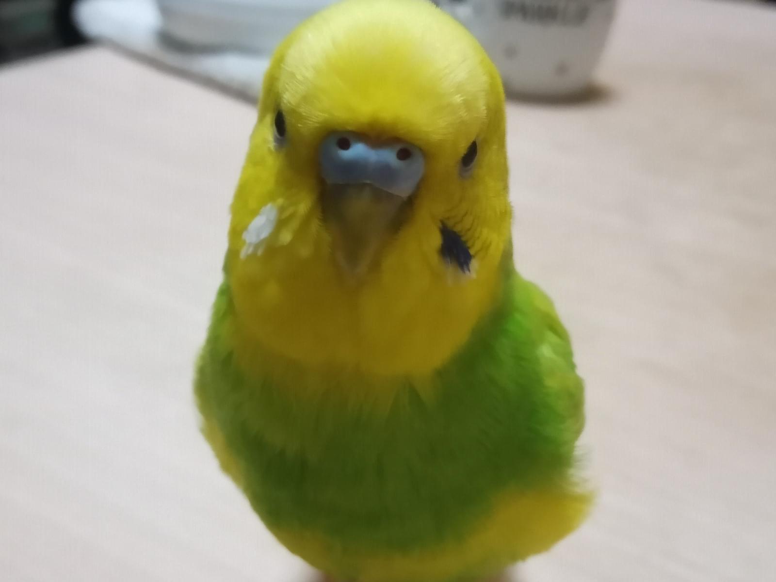 黄色と緑のインコで、右頬に白の点、左頬に青の点があり、お尻に怪我をしています。