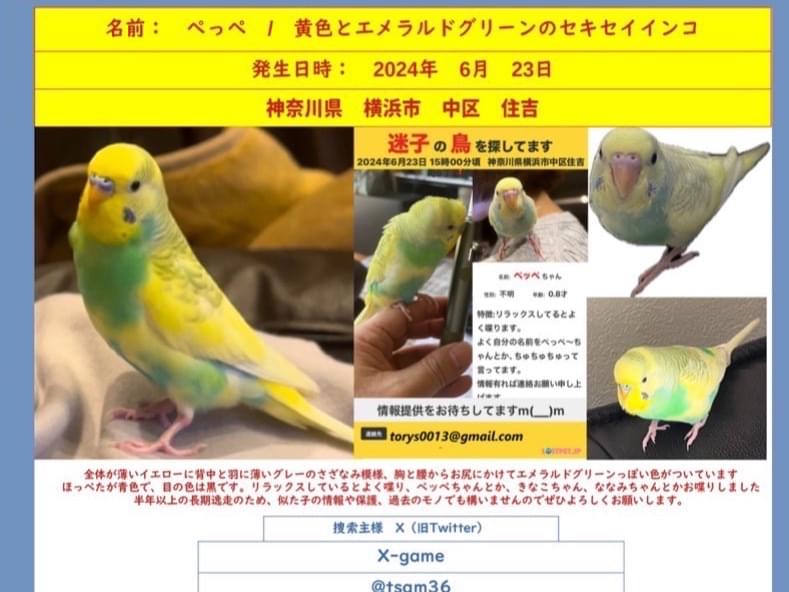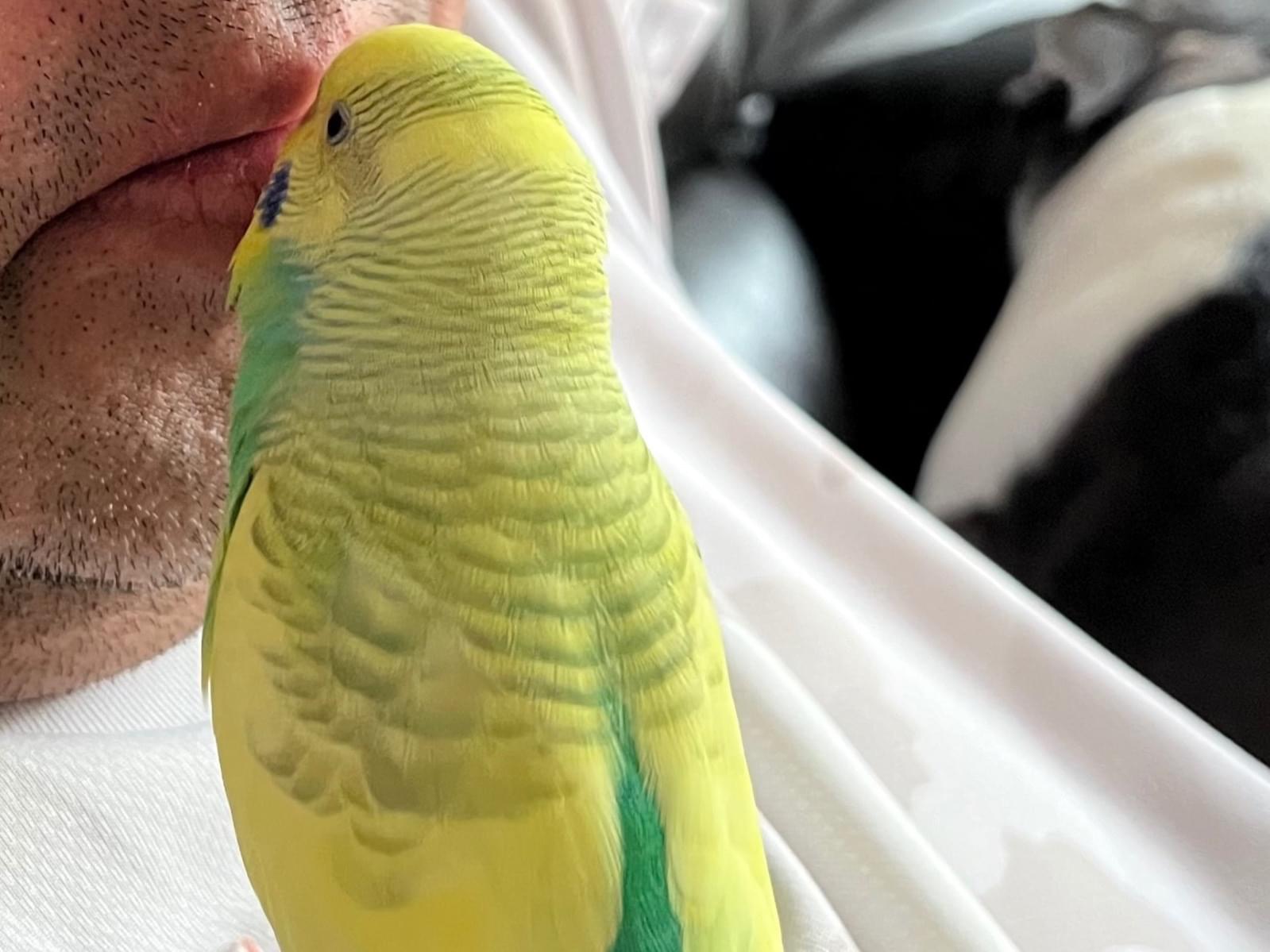全体的にパステルイエローで、お腹と背中にグリーンの色 頭から羽の部分にシマシマの波のような模様があります。