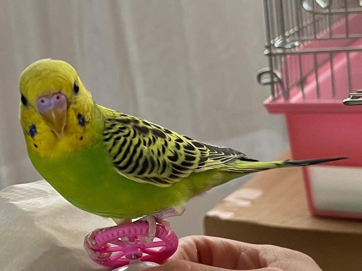 色は緑と黄色のノーマルカラーです。おしゃべりはできません。好奇心旺盛で、動くもの(特にティッシュなどの紙類をヒラヒラさせると興味を示します)を見ると寄ってきます。庭で日光浴をさせていた際、キャリーケースを自分で開けて外へ飛び立ってしまいました。