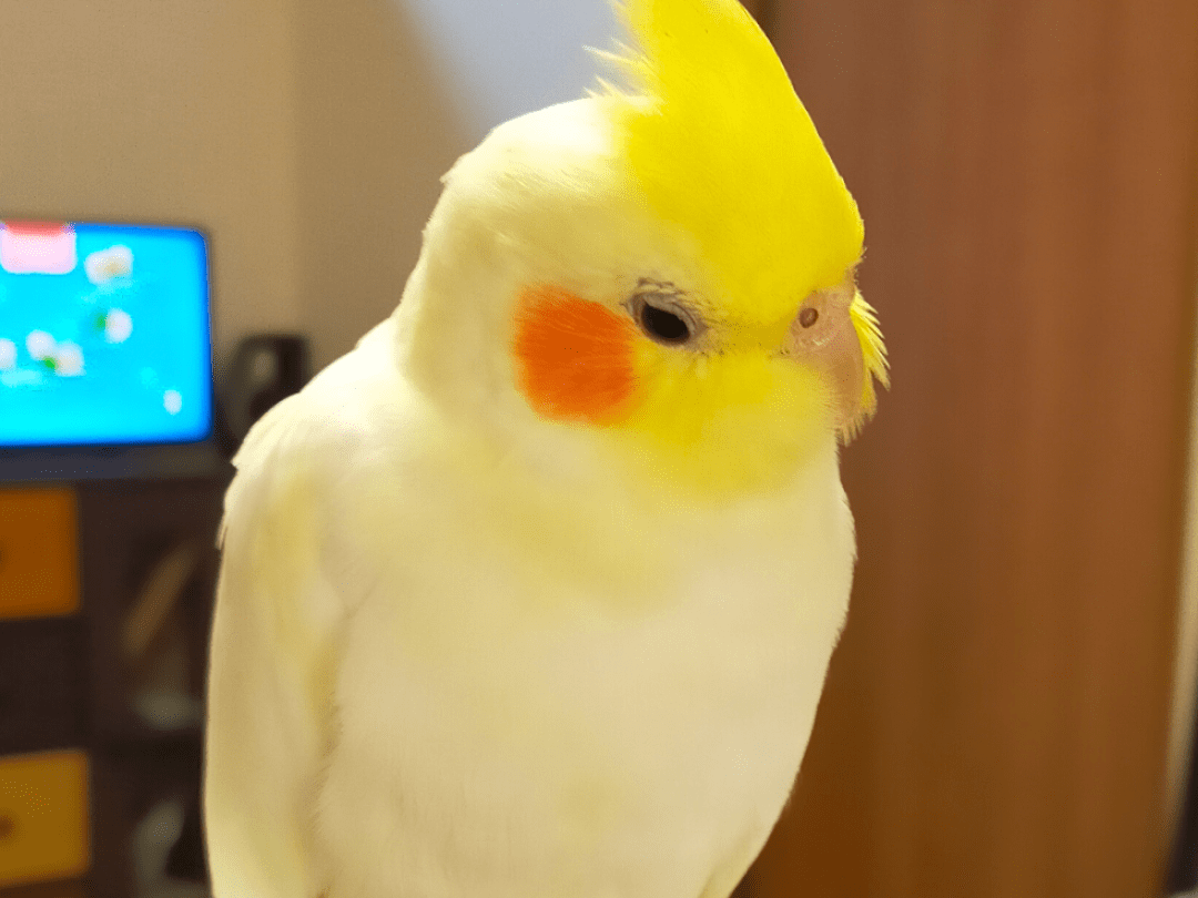 オカメインコのルチノー種で黄色ですが、体は顔に比べ薄い黄色、赤いほっぺが特徴です。高い声で鳴きますが、普段は静かです。人馴れしていて、指に乗ります。肩に乗るのも好きな子です。頭のカキカキは慣れた人だけです。おしゃべりや歌はできません。