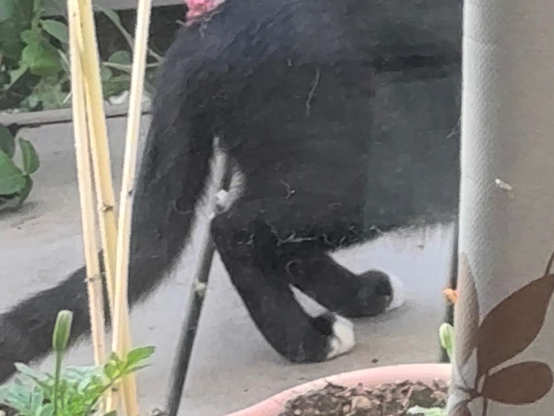 日にちは定かではありませんが七月に自宅に来るようになりました。当時朝昼晩とウッドデッキに座ってましたので2日目にご飯をあげたら勢いよく食べ水も沢山飲みました。怪我、病気はしていないようなので様子見です。今も家の外にいます。日陰を作ってありますので、飼い主の所へ戻る若しくは迷い猫だったら飼い主が来てくれるのを待っています。