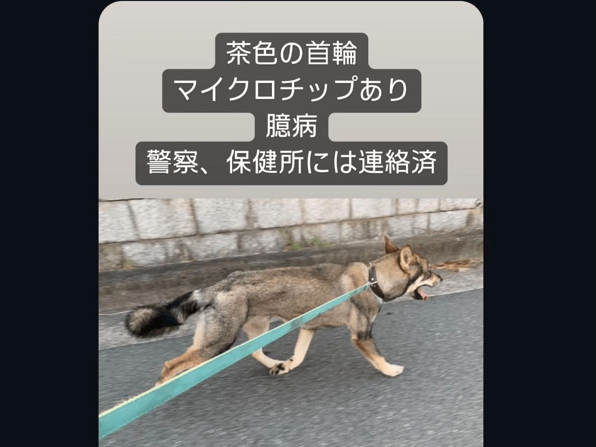私自身は、この子を実際見たことなく本来の飼い主(日本語分からない外国の方)から許可を得て、日本語への拡散をさせて頂いていたり、実際にその方とお会いし一緒に探索をしたり警察署に行ったりとお節介ながら探索協力させて頂いてる第三者的な存在です。(本来の飼い主様、ジモティーへ投稿している代理投稿者と連絡がとれます。)
