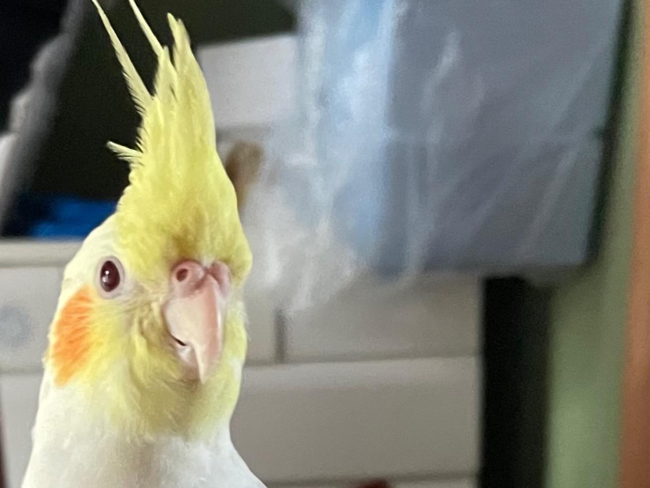 頭が黄色、体がクリーム色、ほっぺがオレンジ色のルチノーのオカメインコです。