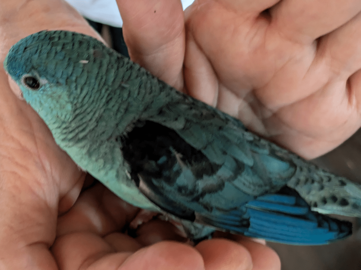 青いインコ(サザナミインコ)で足輪が付いてる子を保護しました