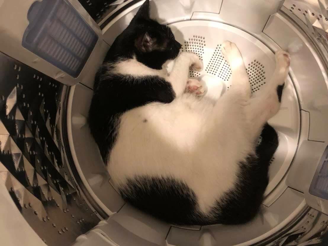 特徴としては、顔全体は黒が多く左鼻の横が丸くホクロのような柄、顎下も黒い。お腹周りは白が多く