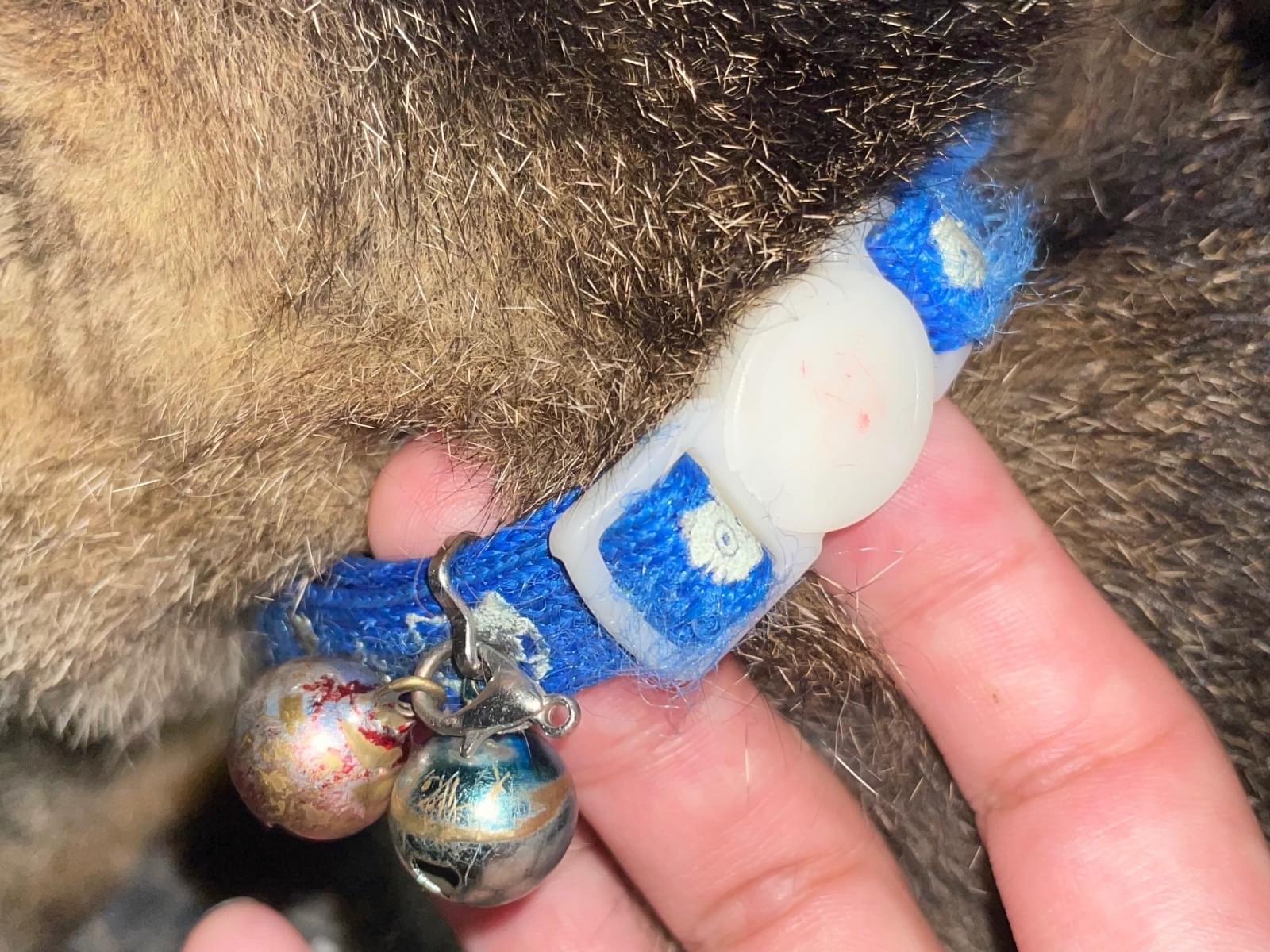 塗装はだいぶ薄れていますが、赤と青の小さな鈴がそれぞれ1つずつついた、青色の首輪をしています。