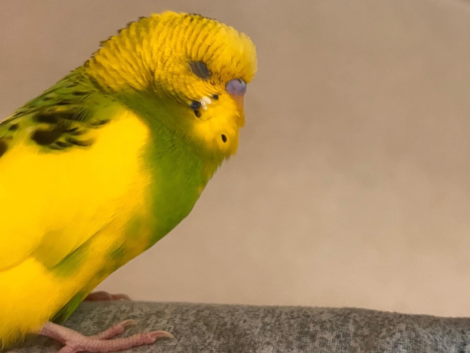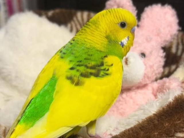 黄色で首周り背中の真ん中くらいに黄緑色があります。肩には黒い斑点があります。
