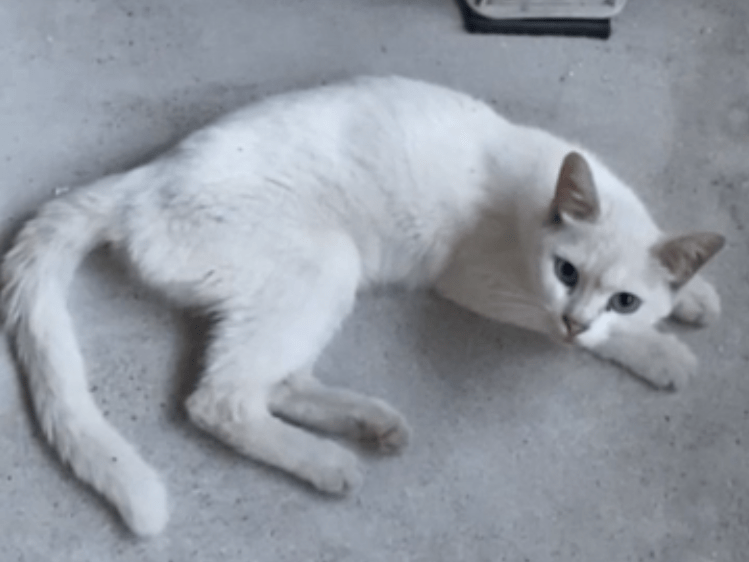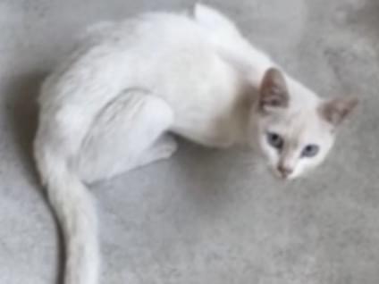 全身白・両目とも青・まっすぐな長い尻尾・かなり痩せて成猫にしては小さい猫です。