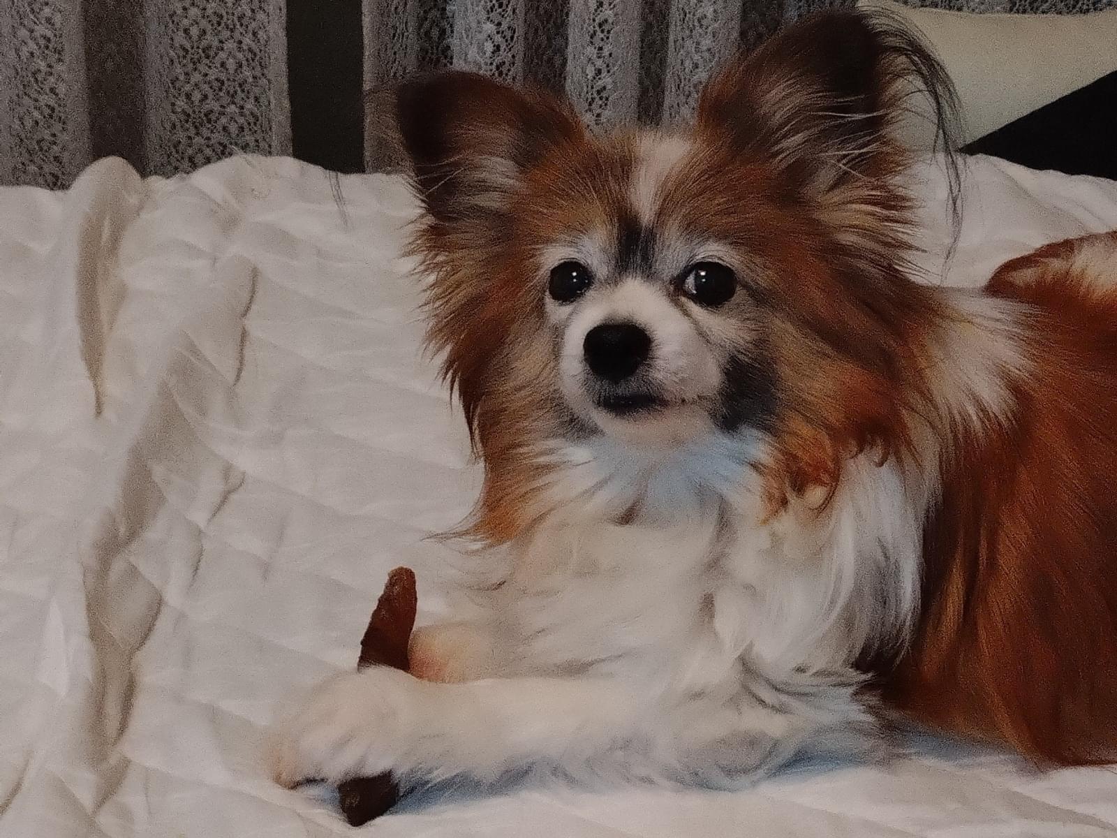 多分青いハーネスが付いています。パピヨンにしては小型です。4キロちょっとです。夏なので、短毛にしていました。
