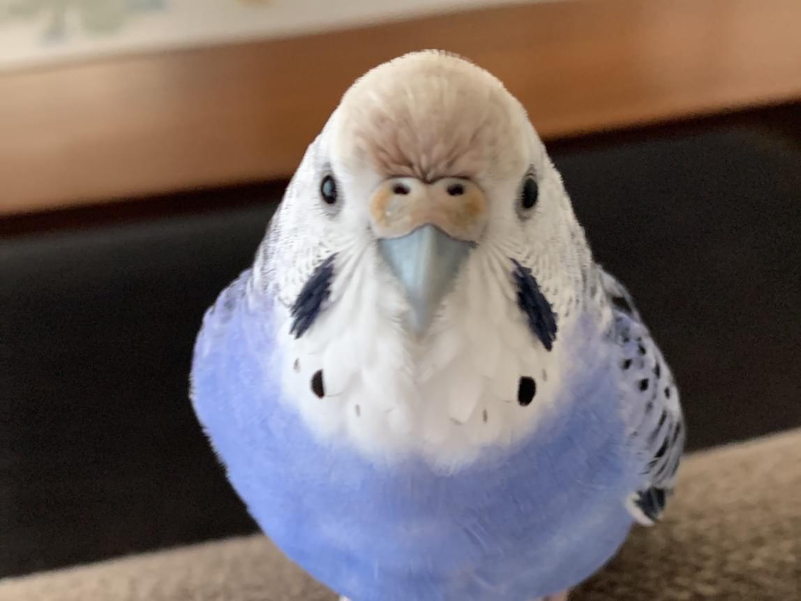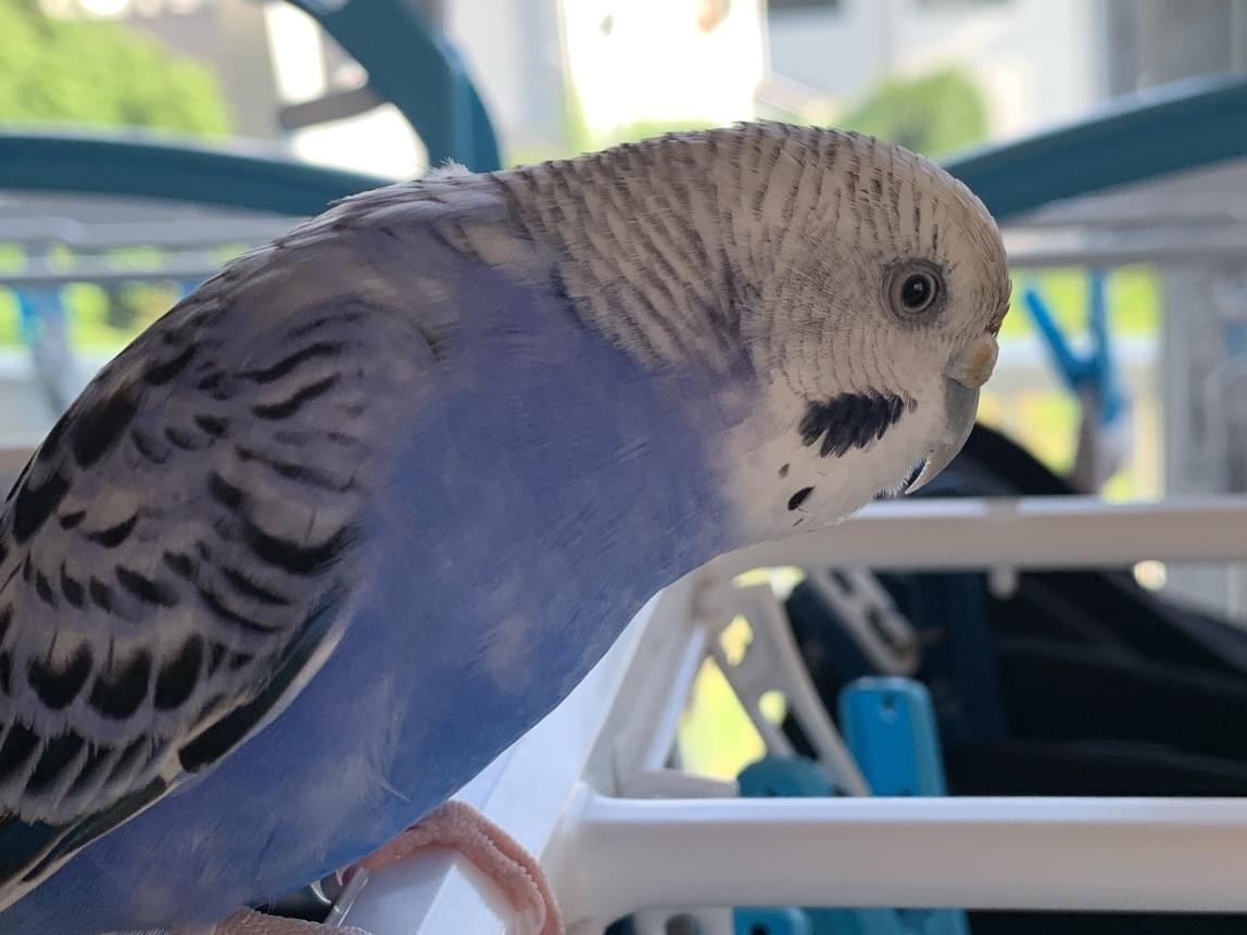 青紫色のセキセイインコです。ピヨピヨとよく鳴きます。手乗りの人馴れしたインコです。
