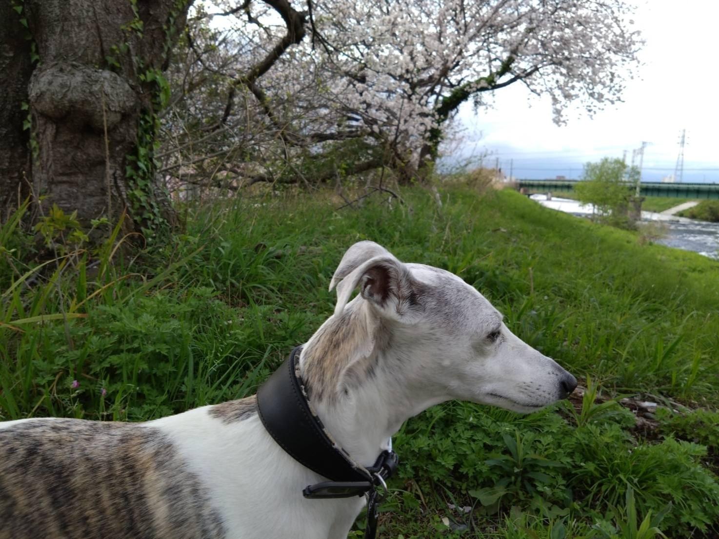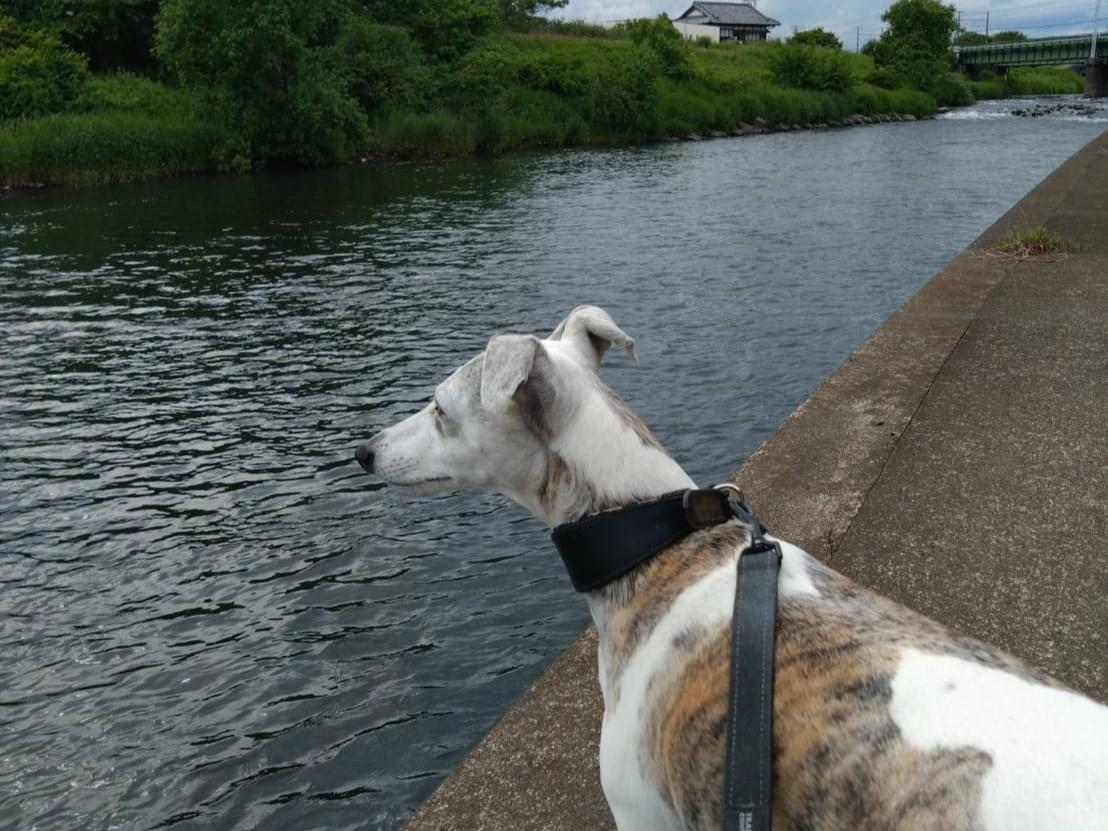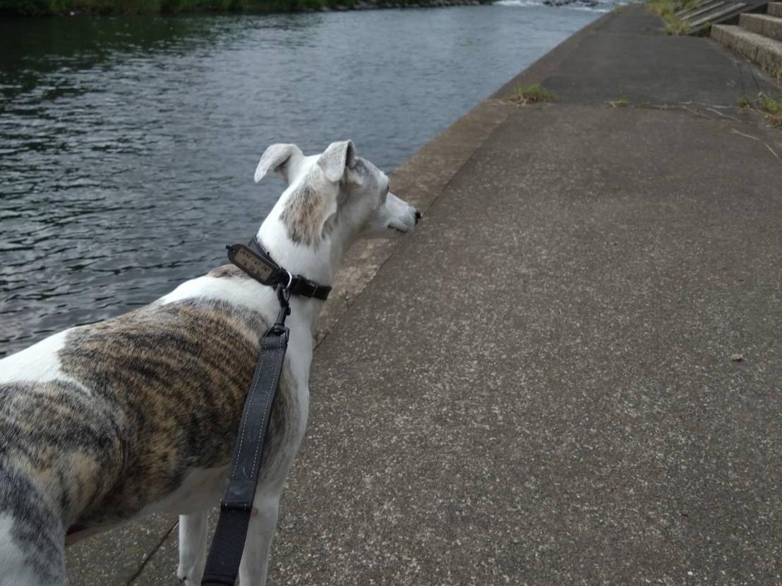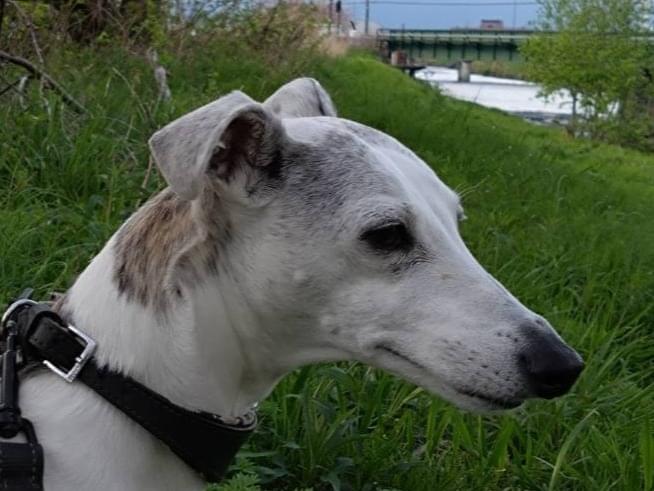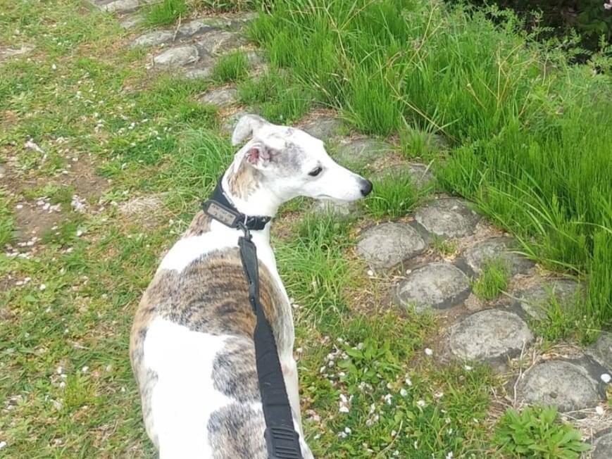 首輪なし、首にイボ、右後ろ足に禿げキズ、避妊済み、臆病、ウィペット