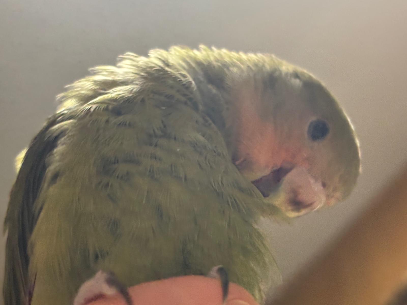 生え際には新しく濃いオレンジ色の羽が小さく生えかかっています。普通のコザクラインコとは少し小さいです。噛みグセがありよく唇を噛んできます。性格は好奇心旺盛です。翼は切られた跡があります。目撃情報、保護がございましたらX(Twitter)でアカウント名沼田アキ(ID@aki_numa87)にDM、インスタでしたらikur_aimuのDMにてご連絡ください。