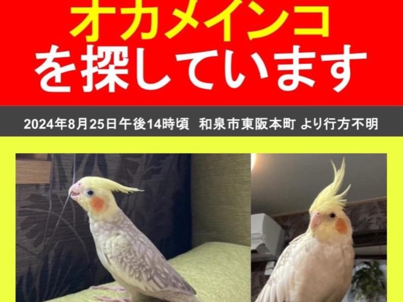 2024年8月25日14時ごろ、大阪府和泉市東阪本町にて、玄関から飛んでいってしまい、行方不明となってしまいました。