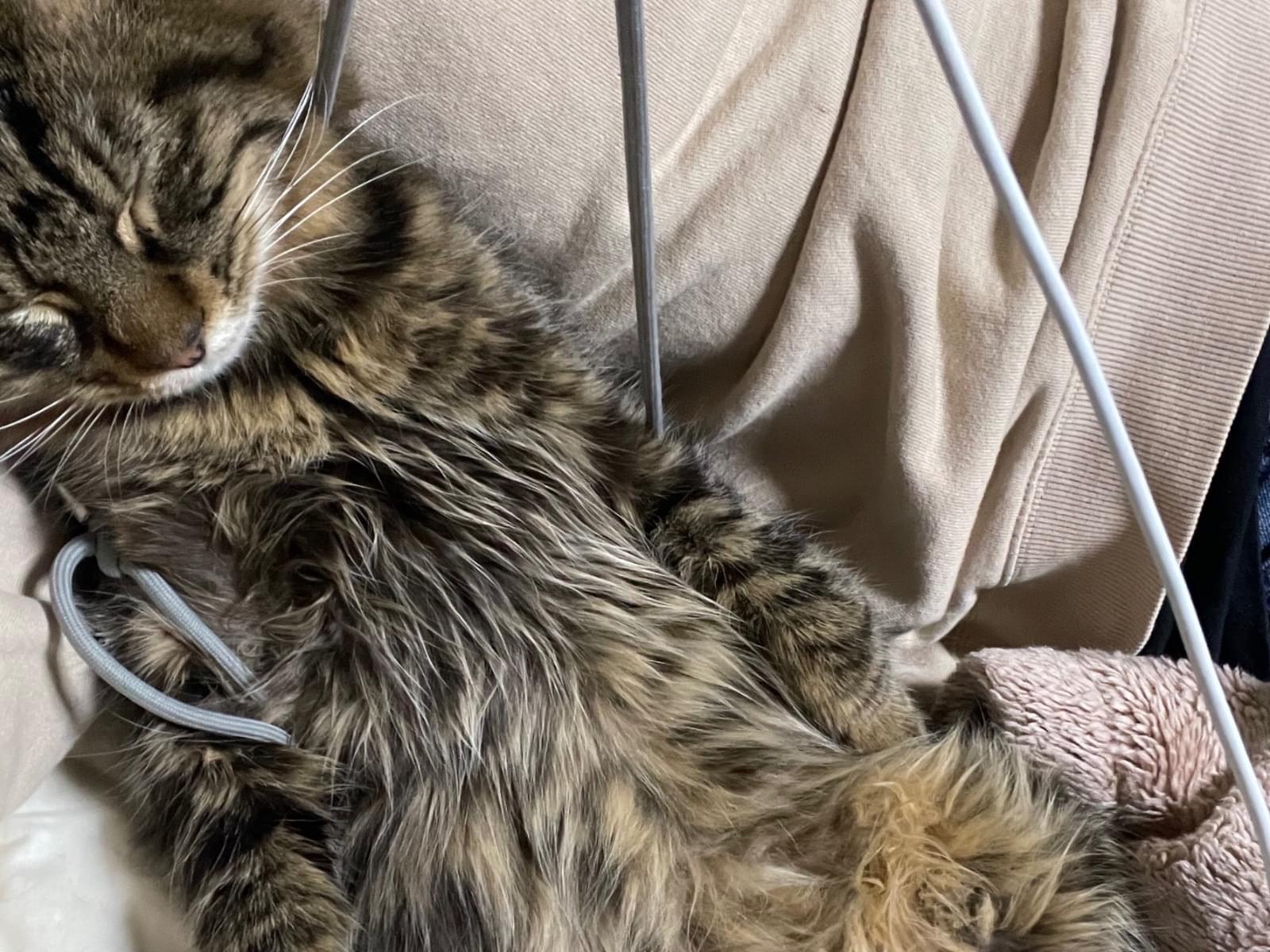 ナツ 明るい茶色(キジトラ) 長毛 水色の首輪 お腹の毛