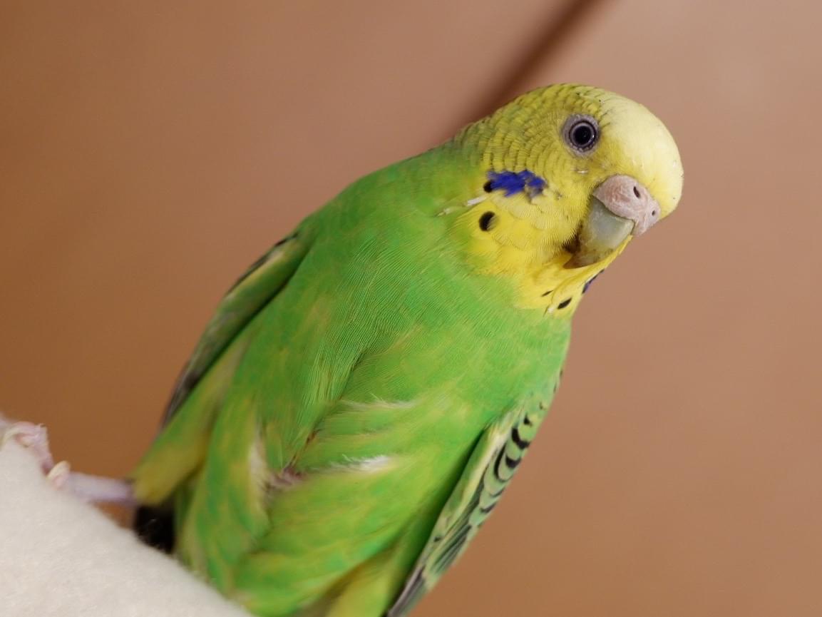 頭が黄色、胴体が黄緑色、尾羽が青色です。