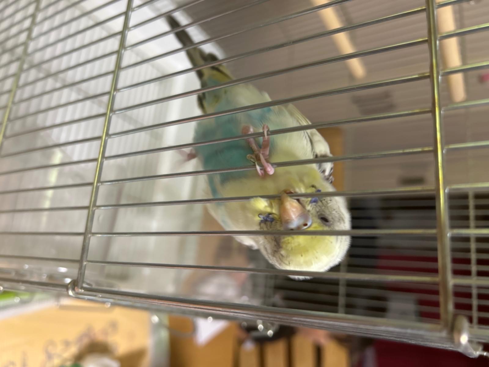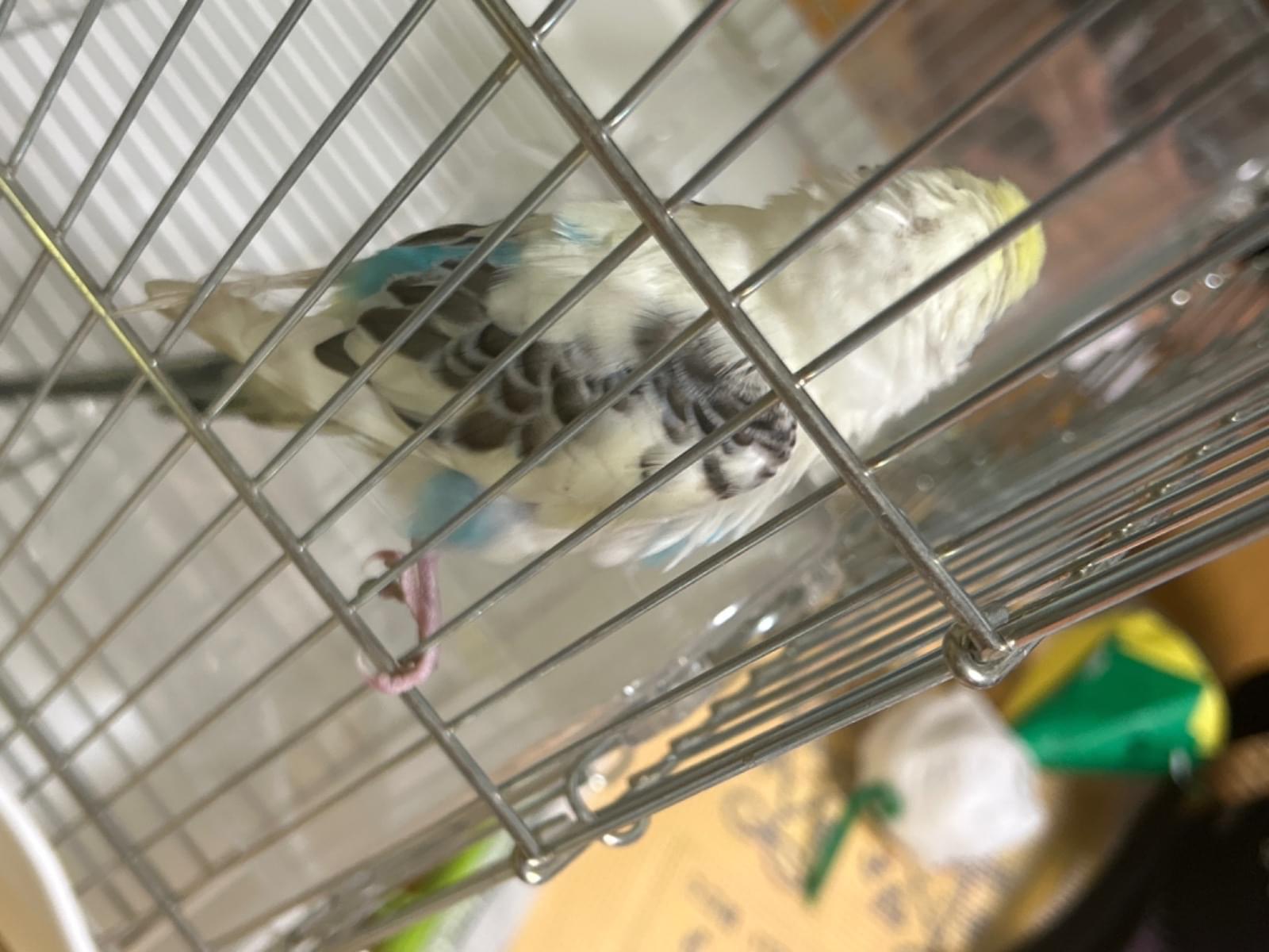 羽が黒と白で、お腹と背中が水色と白、お顔ら辺が薄めの黄色のインコを保護しています。