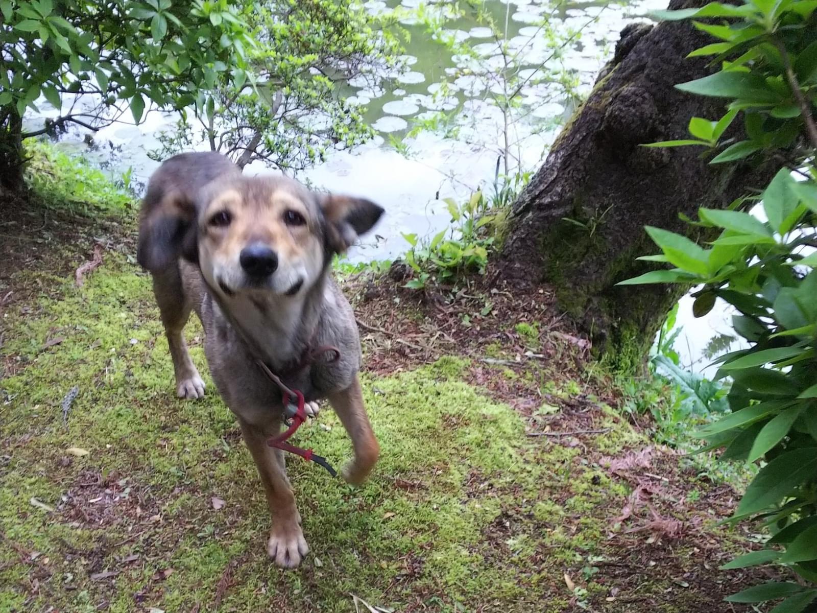 首輪鑑札あり、右耳垂れた茶色の雑種?