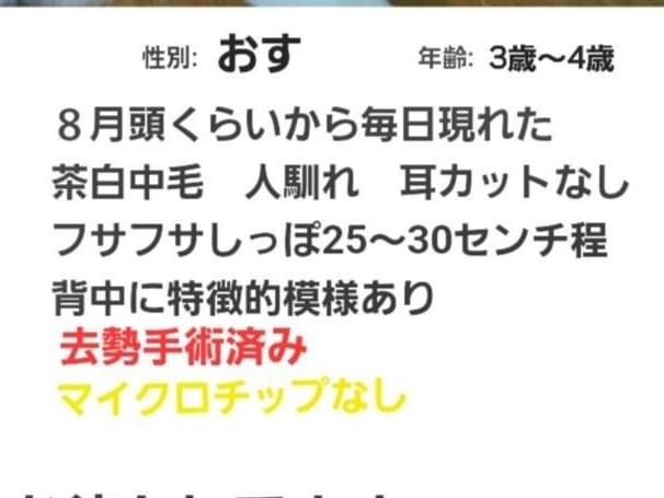 首輪痕跡なく大変人慣れしているので飼い主さんいたのは間違いないと警察へ届けてますので3ヶ月になる11月まで飼い主さん探しています。