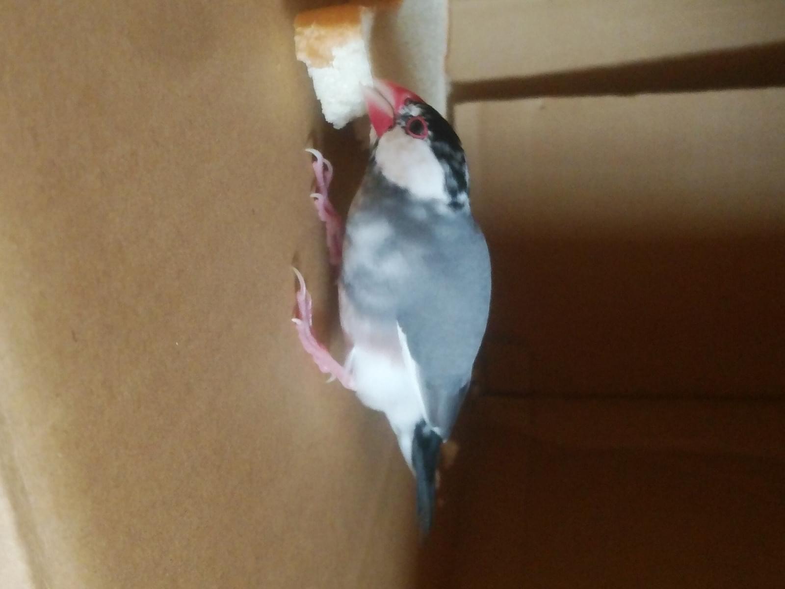 頭、顔に白の斑点が混ざった桜文鳥を保護しました