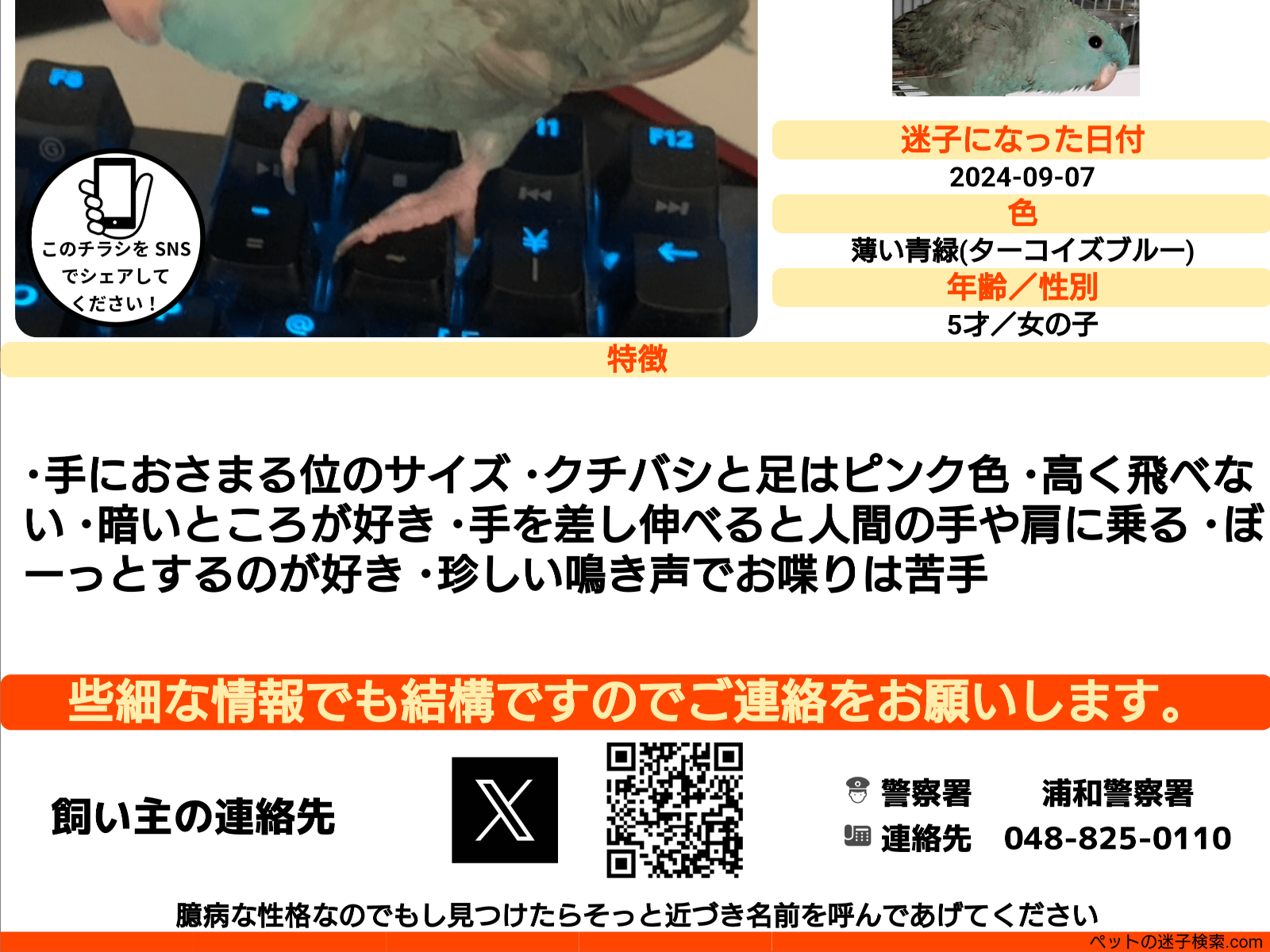 【浦和区岸町一丁目】薄い青緑のサザナミインコ