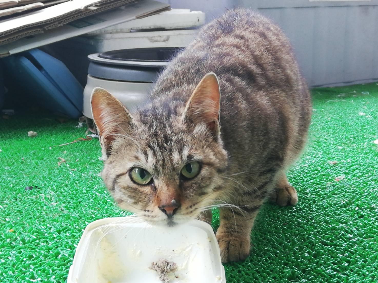 推定1歳半、♂(未去勢)キジトラ。目の色はエメラルドグリーンで少々寄り目です。