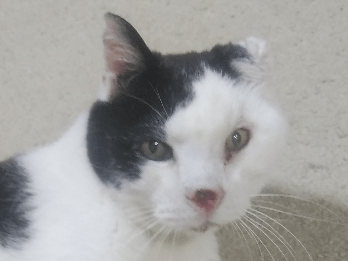 持病(うつるものではありません)のため、目やにがでており、前足も汚れています。鼻はえぐれており、もともとのピンクが、かさぶたで茶色、あるいは自分で掻き取って赤く血が滲んでいます。また、左耳が半ば潰れています。