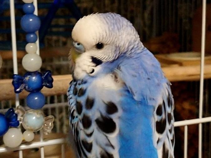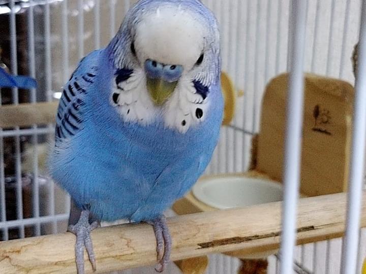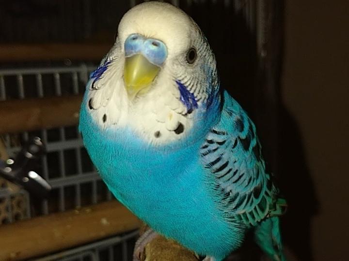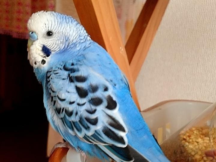 頭は白く頬っぺたに青い点々、身体は青から紫の中間のような色です。鼻が青くキレイだす。羽の尖端は黒く、クリッピングしていますが、右側が少し伸びてきていて部屋でも2メートル位は楽に飛んでいました。