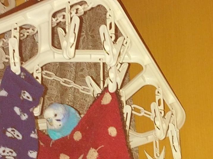 ホントに大人しく肩に乗ってことちゃんが話す言葉を聞き返したり、突っ込みを入れたりおしゃべりが好きな子です。洗濯物の上に乗ってタオルにかじりついたり、ハンガーに乗って揺られてみたり、部屋の中では自由に遊ばせていました。