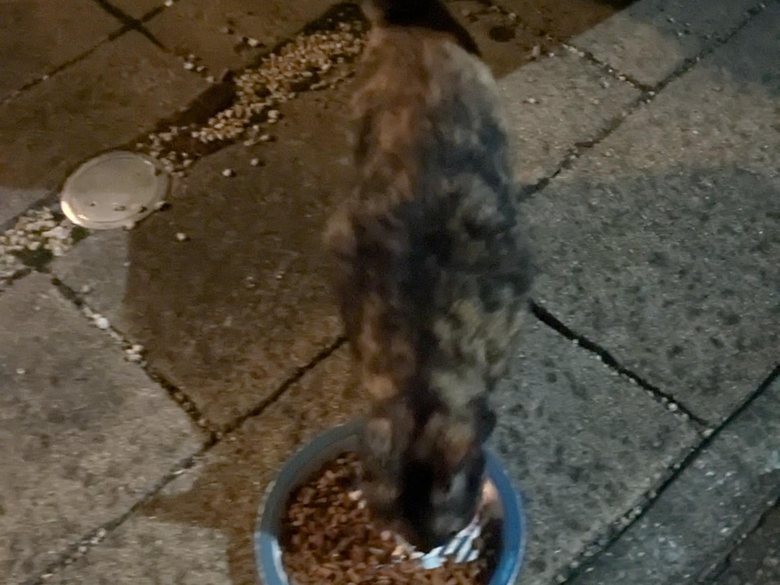 話しかけるように泣きながら顔を茂みからだしてきました。ごはんと水をあげるとうにゃうにゃ言いながら必死で食べました