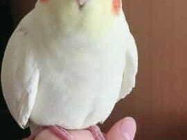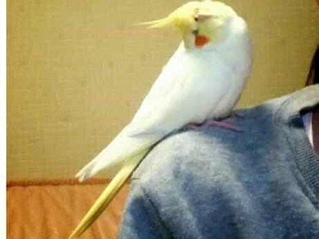 オカメインコ ルチノー 黄色の体で、ほっぺたがオレンジです。体長は20センチ位で、尾が長いです。