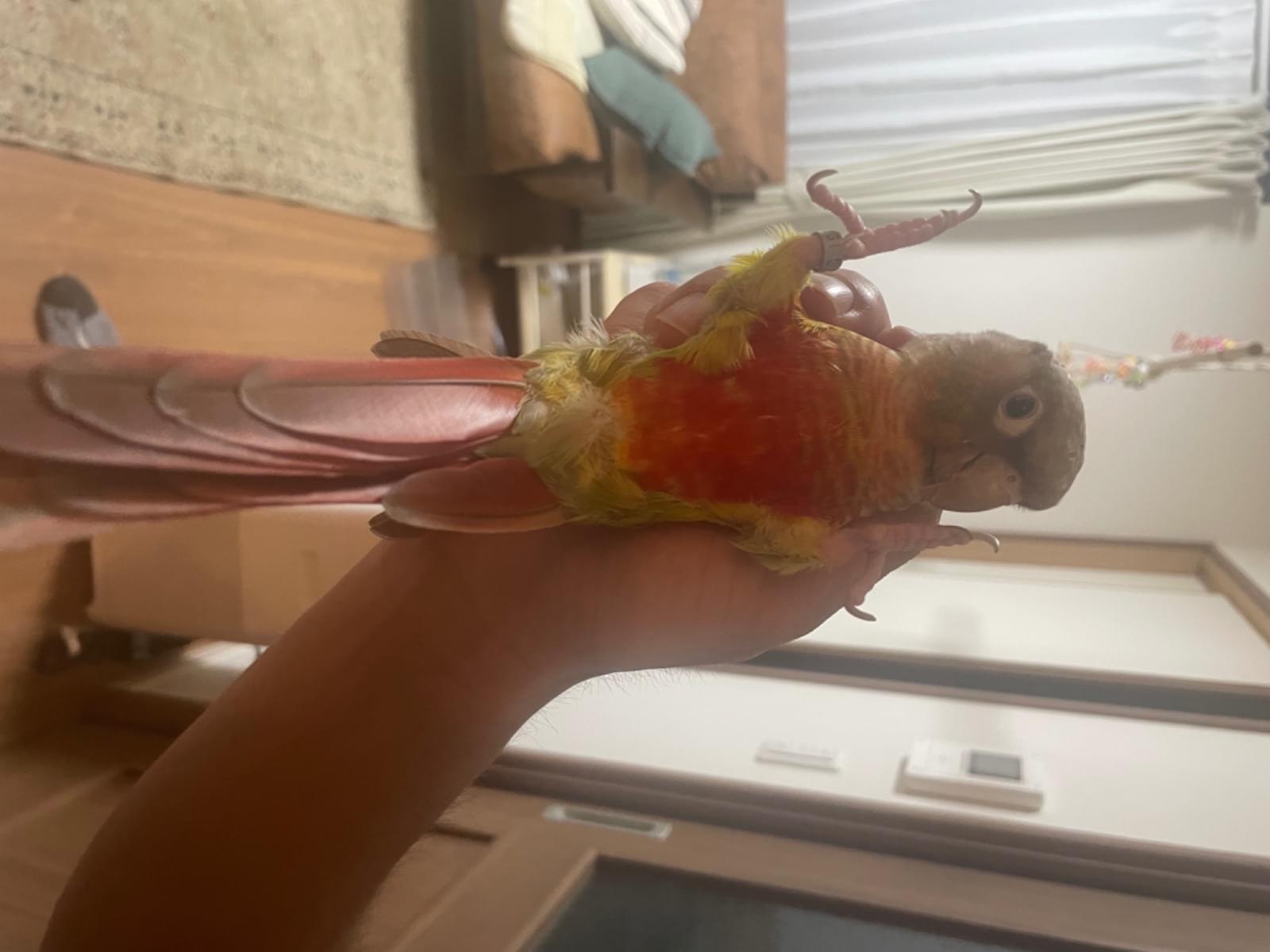 右足にリングついてます。人によく慣れていて肩や頭に乗るのが好きです。