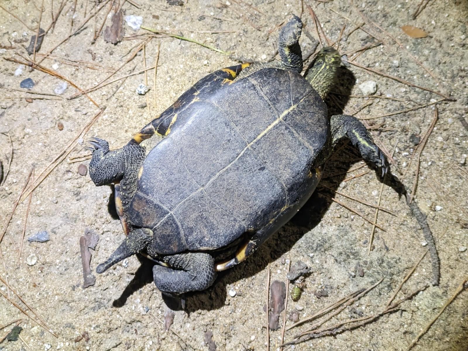 ベンチの近くいました。物音がしたので気付きましたが段差を登ろうとして何度もひっくり返ってました。ここは埋立地なので、この亀を誰かが捨てたか、脱走した亀だと思います。駐車場がすぐ隣なので飼い主が捨てたのが濃厚です。大きさは20センチぐらいです。