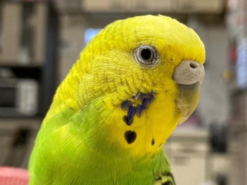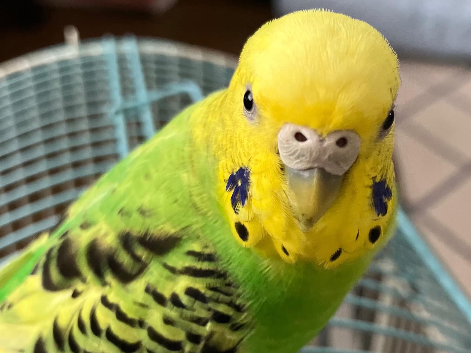 頭が黄色、お腹が黄緑色のセキセイインコです