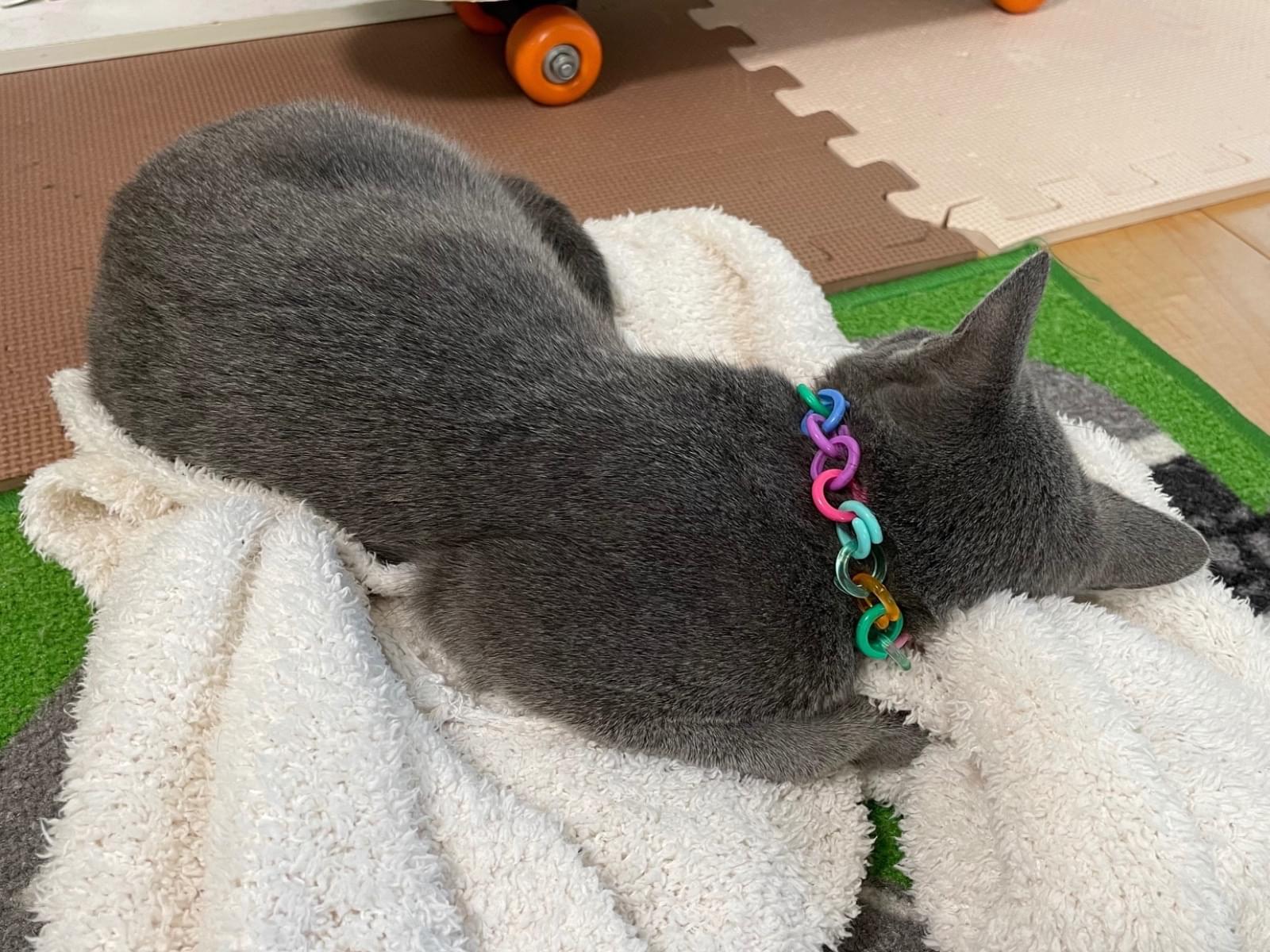 子供のおもちゃのプラスチックの輪っかチェーンを繋ぎ合わせたカラフルな首輪を付けています。(鈴付き)