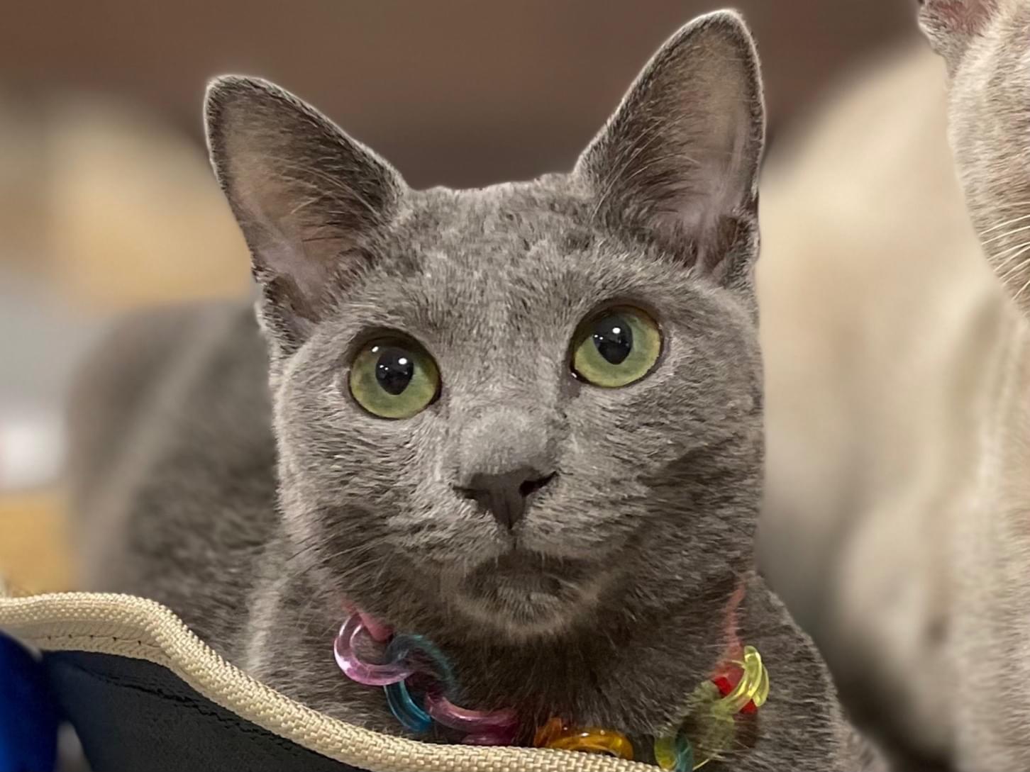 シルバーグレーの毛並み、瞳はグリーン、3kg前後のやや小さめの成猫です。