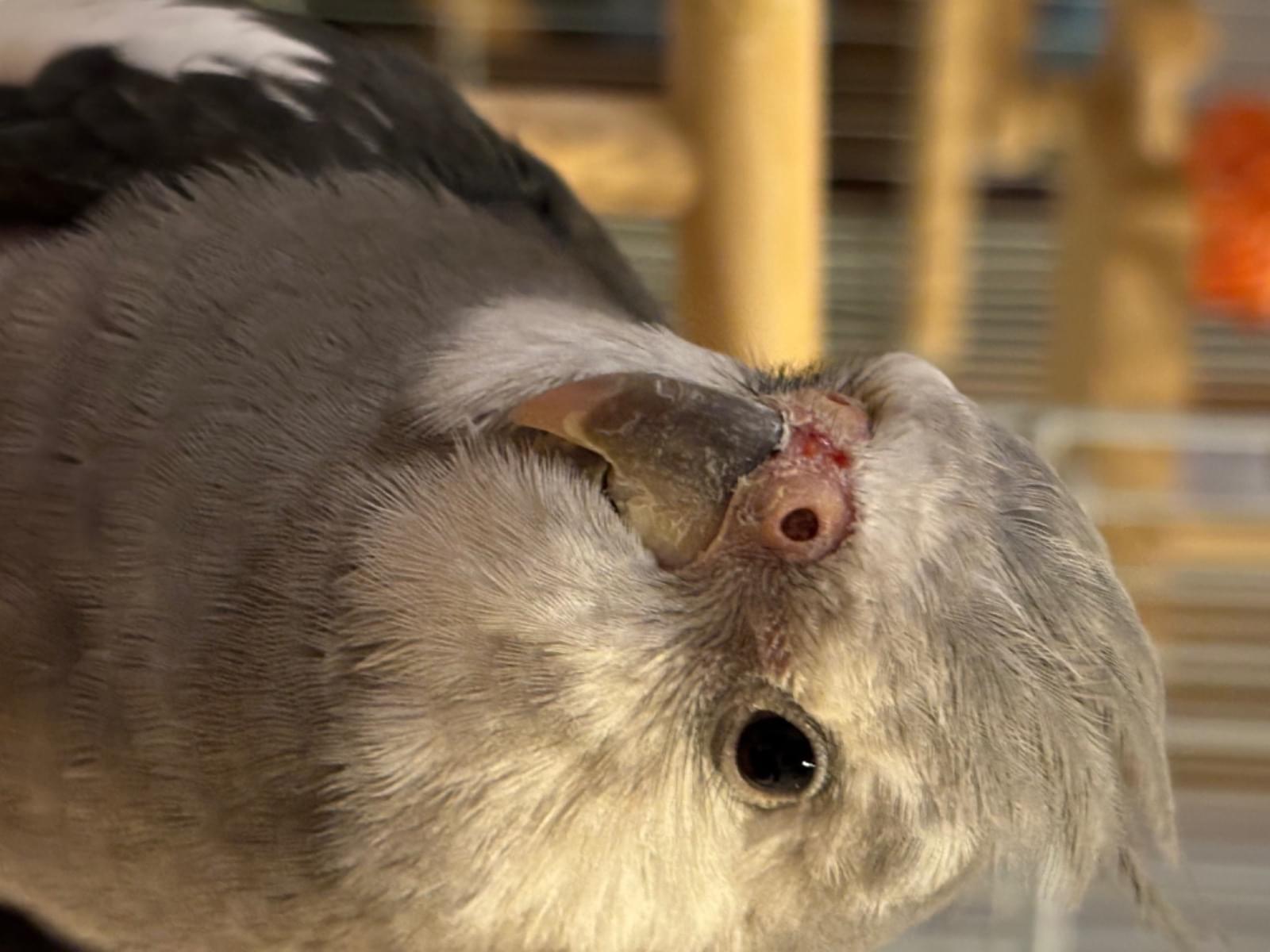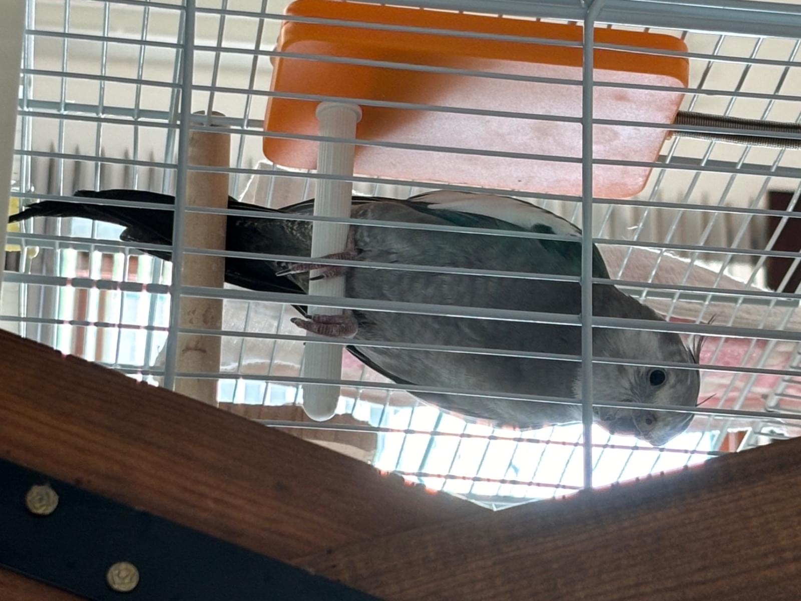 ねずみ色の顔だけ白いオカメインコです。ほっぺが白いです。肩にのったのに気づかず空に飛んでいきました。何も身につけていません。他のオカメインコより太めでぼてっとしていますが飛んで痩せてると思います。