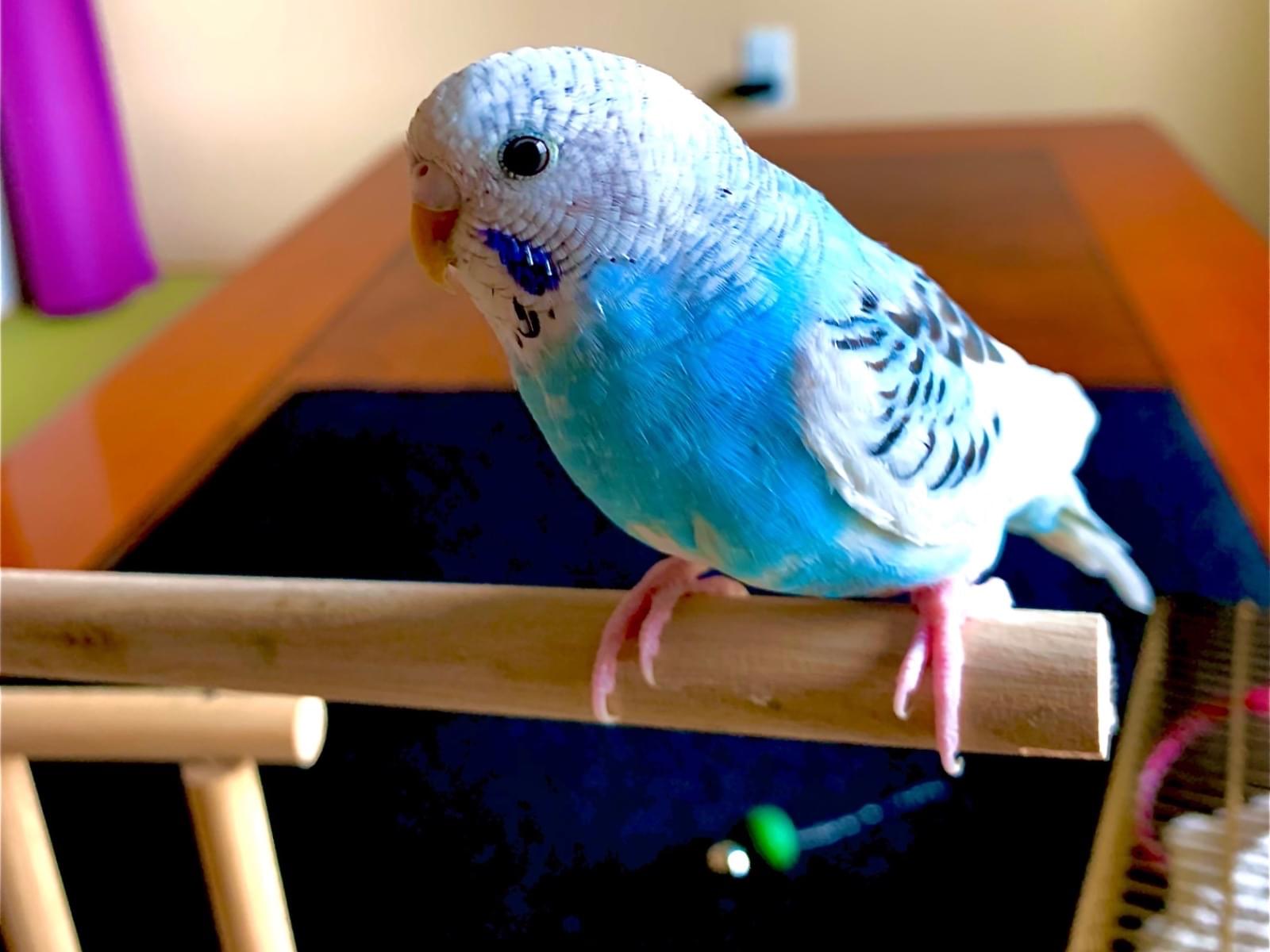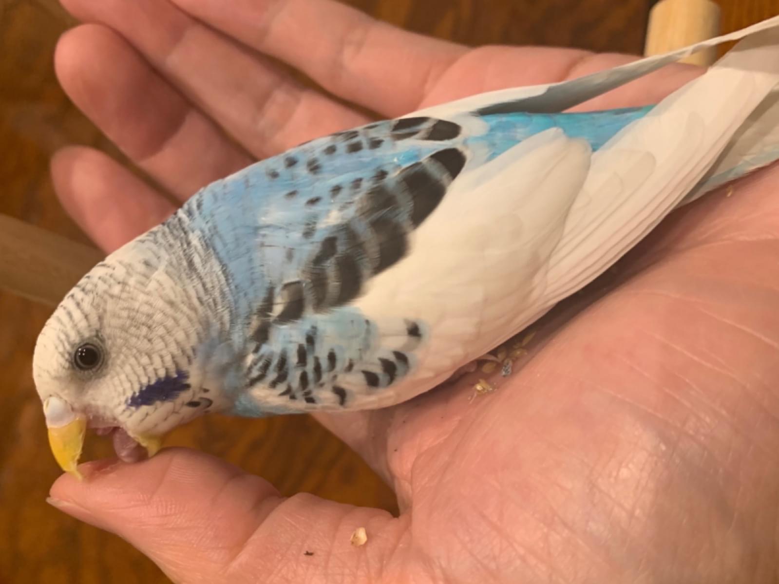 白と水色のセキセイインコです、お喋りはしません ピーちゃんと呼ぶとピーッピーッと鳴きます