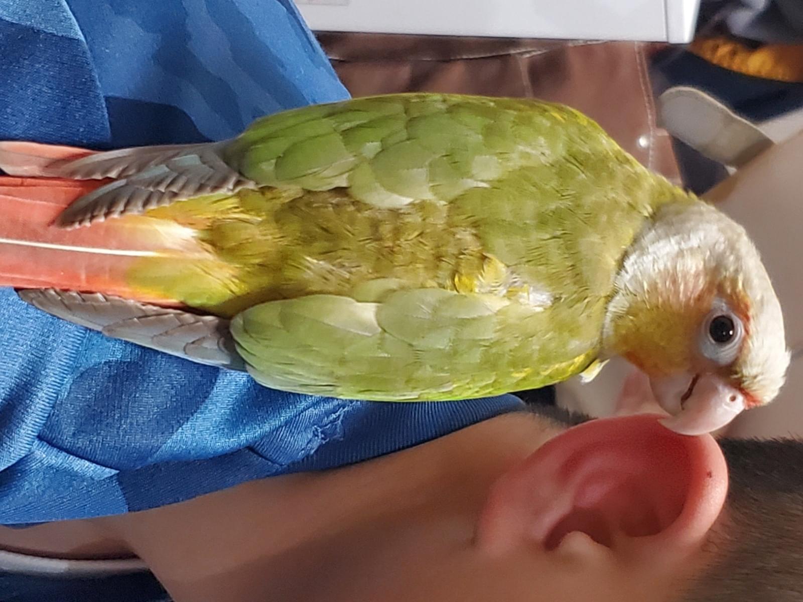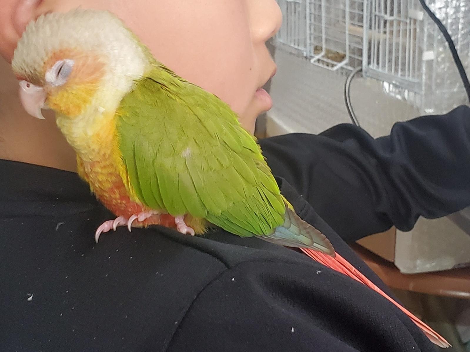 とても人懐っこく、人差し指を止まり木のようにして「パインちゃんおいで」と手を差し出すと止まってくれます。