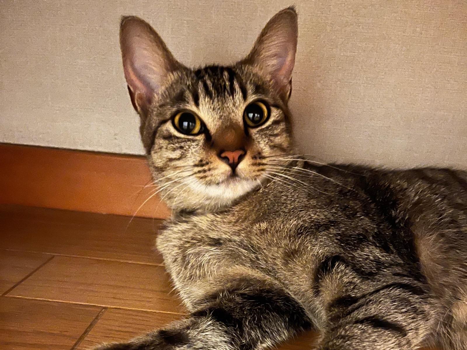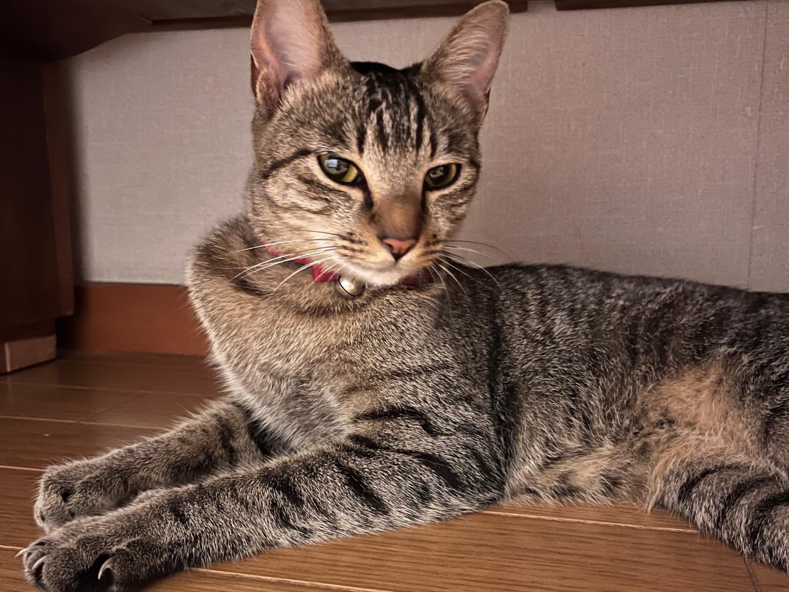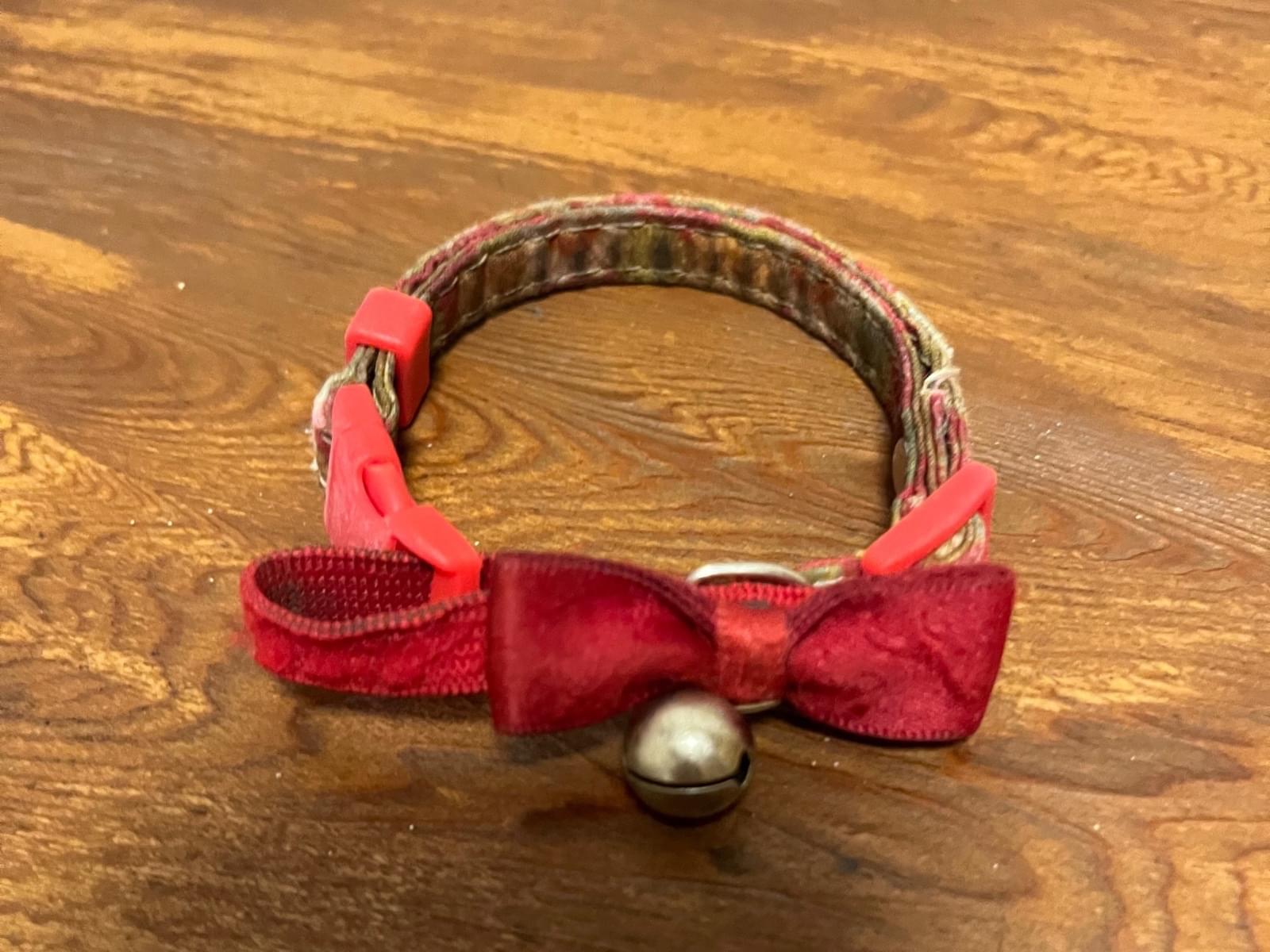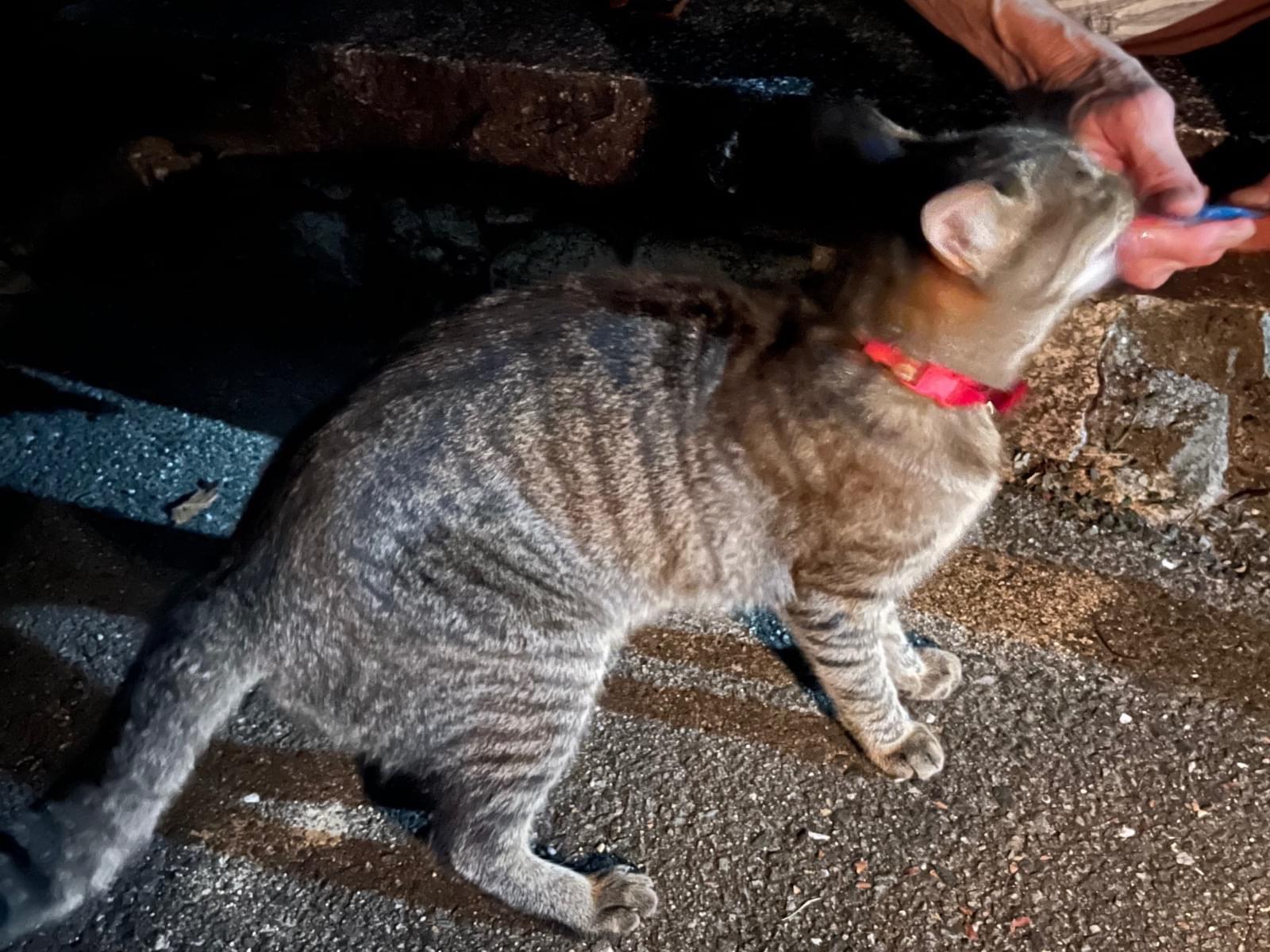 赤い首輪をしている迷子のキジトラ猫を保護しました