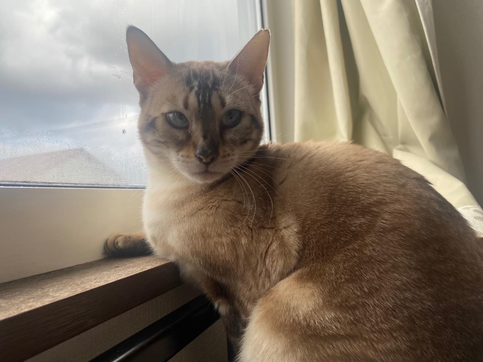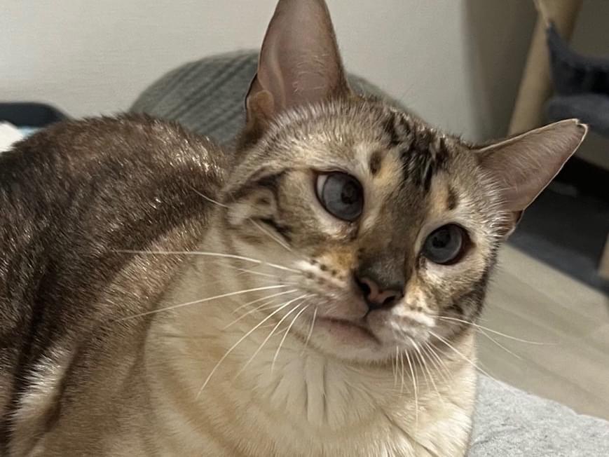 背中がグレージュの様な色でお腹あたりは白っぽいベージュの色、目が水色の女の子